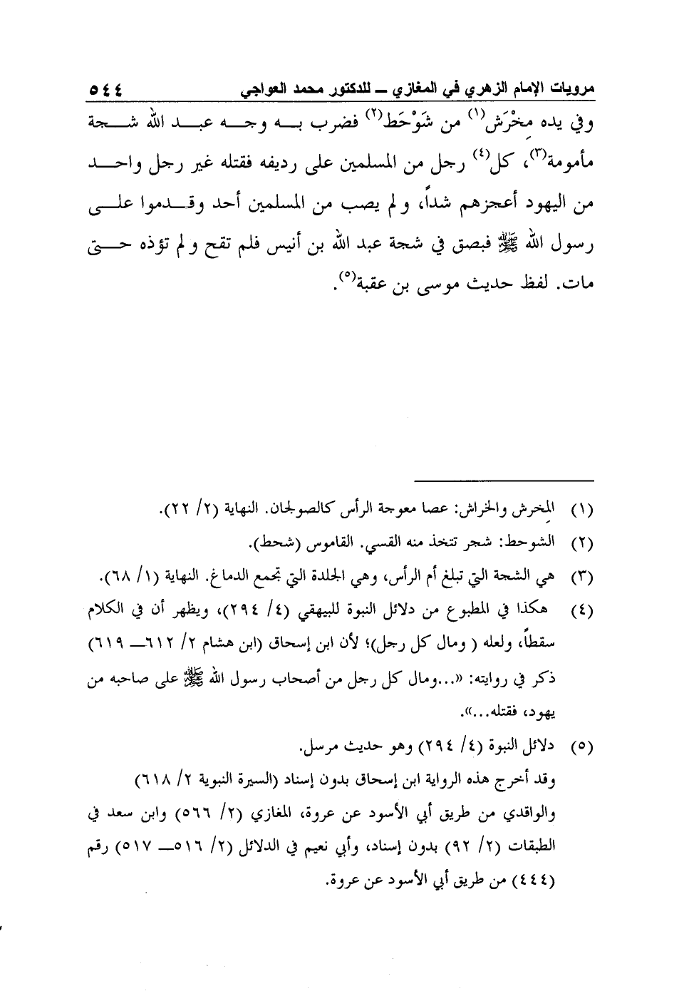 وفي يده مِخْرَش1 من شَوْحَط2 فضرب به وجه عبد الله شجة مأمومة3، كل4 رجل من المسلمين على رديفه فقتله غير رجل واحد من اليهود أعجزهم شداً، ولم يصب من المسلمين أحد وقدموا على رسول الله صلى الله عليه وسلم فبصق في شجة عبد الله بن أنيس فلم تقح ولم تؤذه حتى مات. لفظ حديث موسى بن عقبة5.