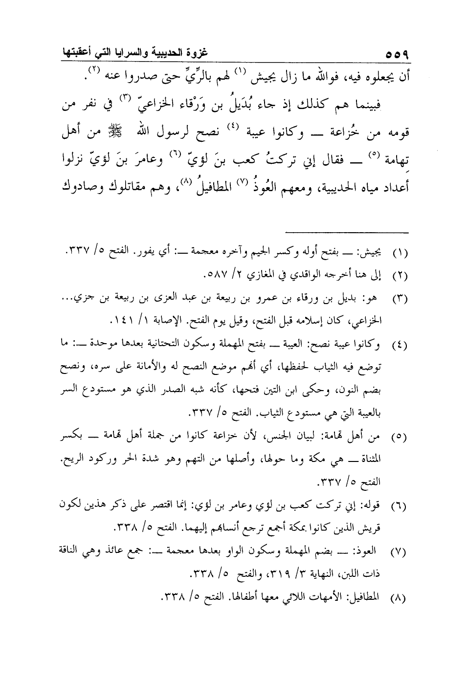 فبينما هم كذلك إذ جاء بُدَي لُ بن وَرْقاء الخزاعيّ3 في نفر من قومه من خُزاعة - وكانوا عيبة4 نصح لرسول الله صلى الله عليه وسلم من أهل تِهامة5 - فقال إني تركتُ كعب بنَ لؤيّ6 وعامرَ بنَ لؤيّ نزلوا أعداد مياه الحديبية، ومعهم العُوذُ7 المطافيلُ8، وهم مقاتلوك وصادوك