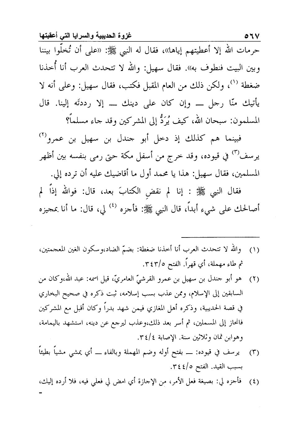حرمات الله إلا أعطيتهم إياها"، فقال له النبي صلى الله عليه وسلم: "على أن تُخلّوا بيننا وبين البيت فنطوف به". فقال سهيل: والله لا تتحدث العرب أنا أُخذنا ضغطة1، ولكن ذلك من العام المقبل فكتب، فقال سهيل: وعلى أنه لا يأتيك منّا رجل - وإن كان على دينك - إلا رددتَه إلينا. قال المسلمون: سبحان الله، كيف يُرَدُّ إلى المشركين وقد جاء مسلماً؟