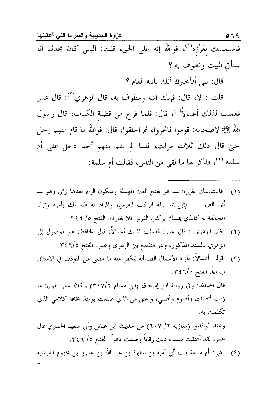2 قال الزهري: "قال عمر: فعملت لذلك أعمالاً": قال الحافظ: "هو موصول إلى الزهري بالسند المذكور، وهو منقطع بين الزهري وعمر" الفتح 5/346.