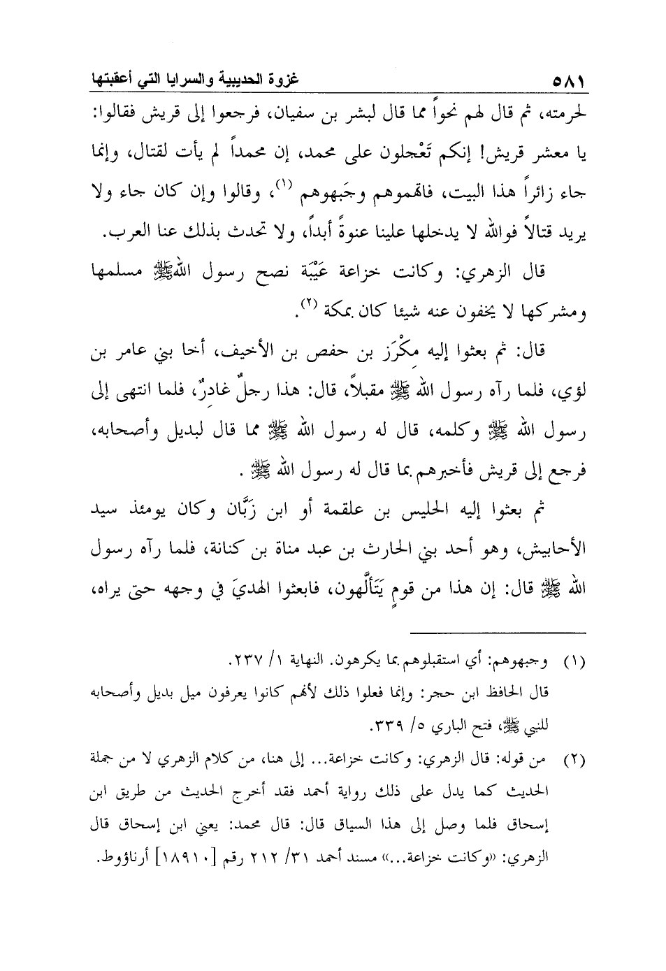 2 من قوله: قال الزهري: وكانت خزاعة ... إلى هنا، من كلام الزهري لا من جملة الحديث كما يدل على ذلك رواية أحمد فقد أخرج الحديث من طريق ابن إسحاق فلما وصل إلى هذا السياق قال: قال محمد: يعني ابن إسحاق قال الزهري: (وكانت خزاعة ... ) مسند أحمد 31/ 212 رقم [18910] أرناؤوط.