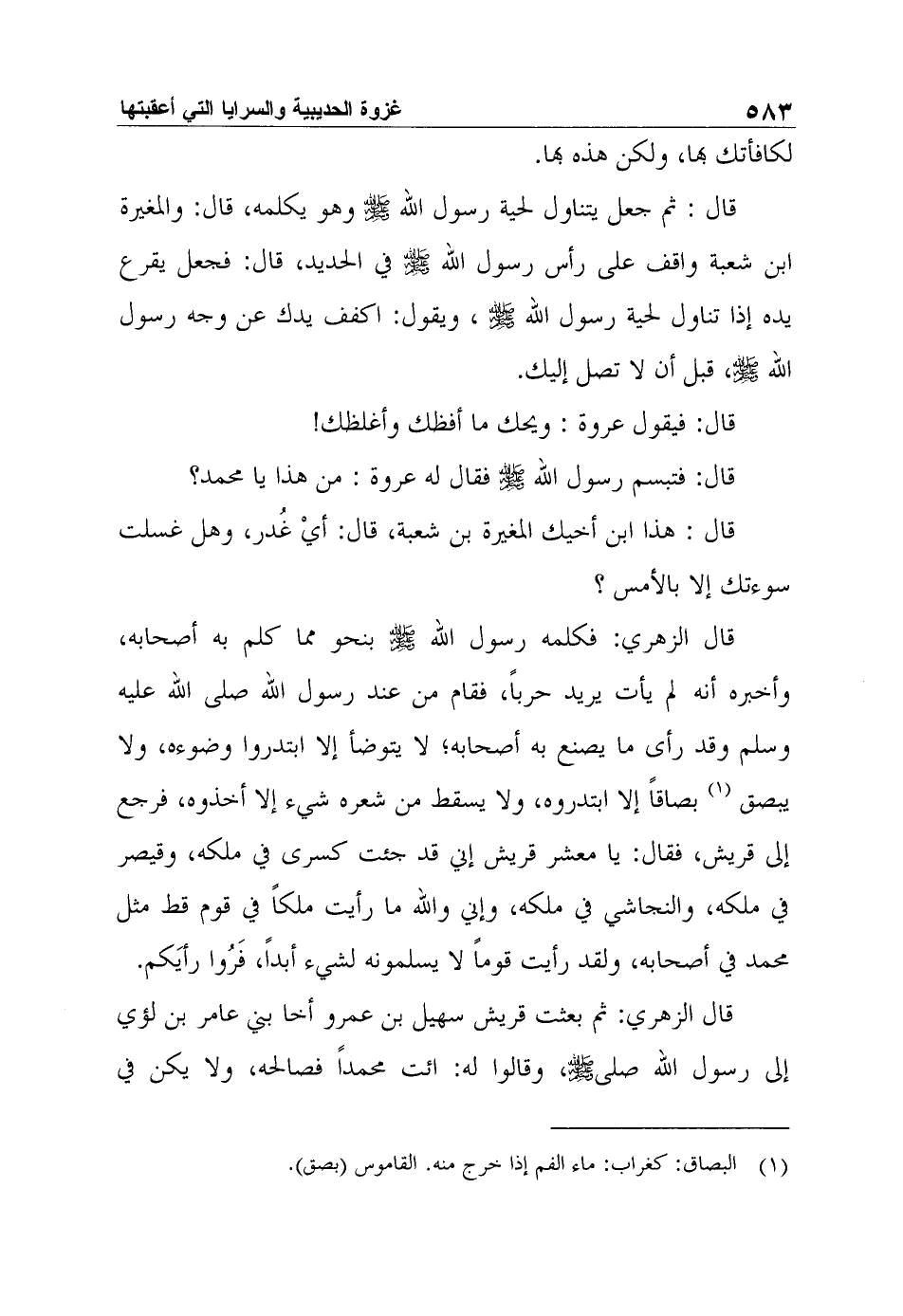 قال: ثم جعل يتناول لحية رسول الله صلى الله عليه وسلم وهو يكلمه، قال: والمغيرة ابن شعبة واقف على رأس رسول الله صلى الله عليه وسلم في الحديد، قال: فجعل يقرع يده إذا تناول لحية رسول الله صلى الله عليه وسلم، ويقول: اكفف يدك عن وجه رسول الله صلى الله عليه وسلم، قبل أن لا تصل إليك.