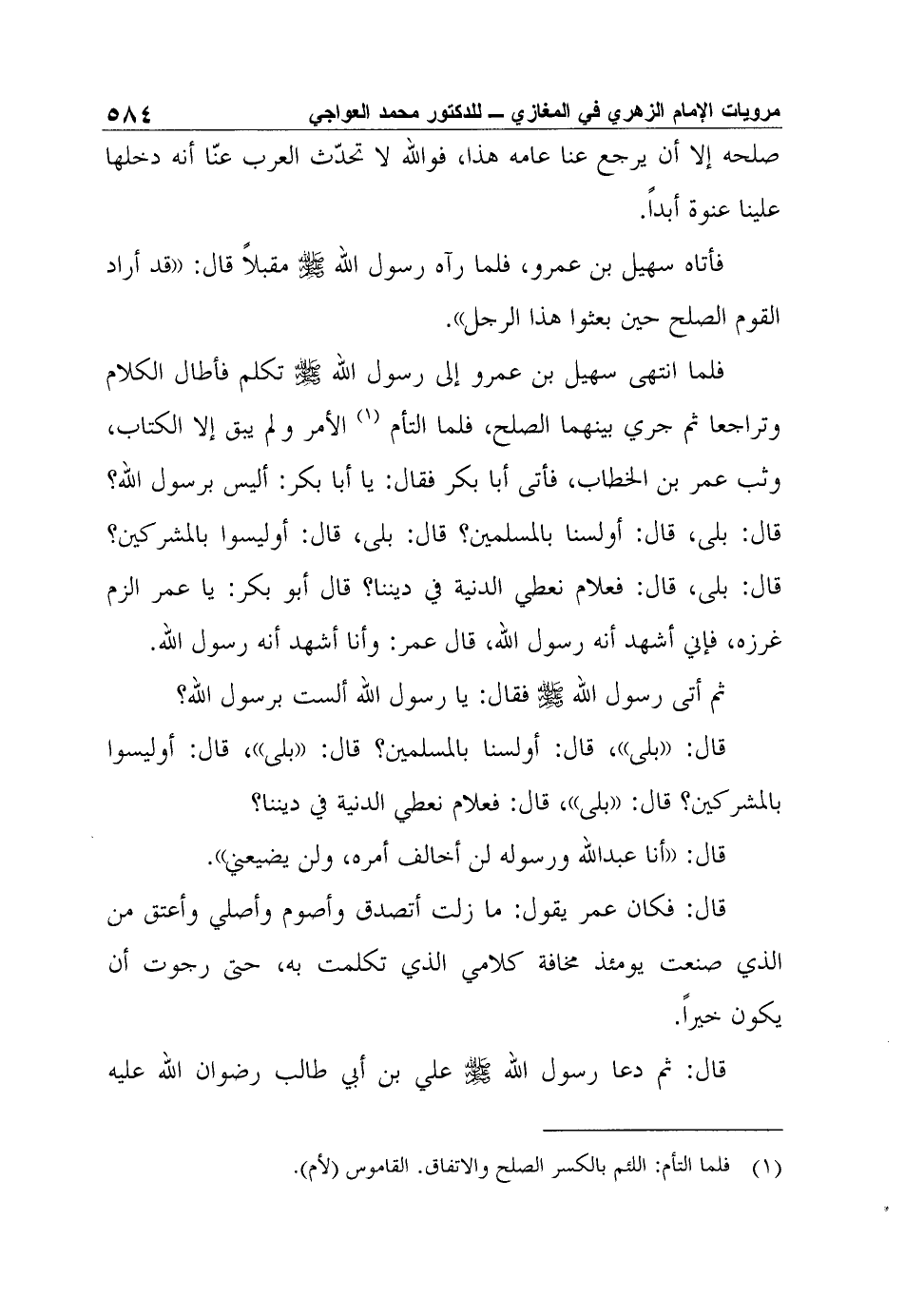 فلما انتهى سهيل بن عمرو إلى رسول الله صلى الله عليه وسلم تكلم فأطال الكلام وتراجعا ثم جري بينهما الصلح، فلما التأم1 الأمر ولم يبق إلا الكتاب، وثب عمر بن الخطاب، فأتى أبا بكر فقال: يا أبا بكر: أليس برسول الله؟ قال: بلى، قال: أولسنا بالمسلمين؟ قال: بلى، قال: أوليسوا بالمشركين؟ قال: بلى، قال: فعلام نعطي الدنية في ديننا؟ قال أبو بكر: يا عمر الزم غرزه، فإني أشهد أنه رسول الله، قال عمر: وأنا أشهد أنه رسول الله.