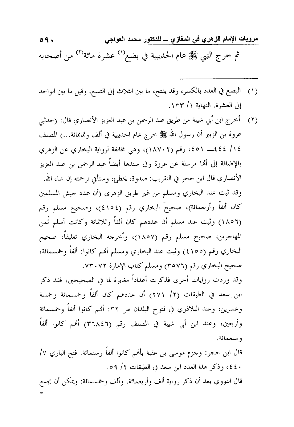 2 أخرج ابن أبي شيبة من طريق عبد الرحمن بن عبد العزيز الأنصاري قال: "حدثني عروة بن الزبير أن رسول الله صلى الله عليه وسلم خرج عام الحديبية في ألف وثمانمائة ... " المصنف 14/ 444- 451، رقم (18702) ، وهي مخالفة لرواية البخاري عن الزهري بالإضافة إلى أنها مرسلة عن عروة وفي سندها أيضاً عبد الرحمن بن عبد العزيز الأنصاري قال ابن حجر في التقريب: صدوق يخطئ، وستأتي ترجمته إن شاء الله.