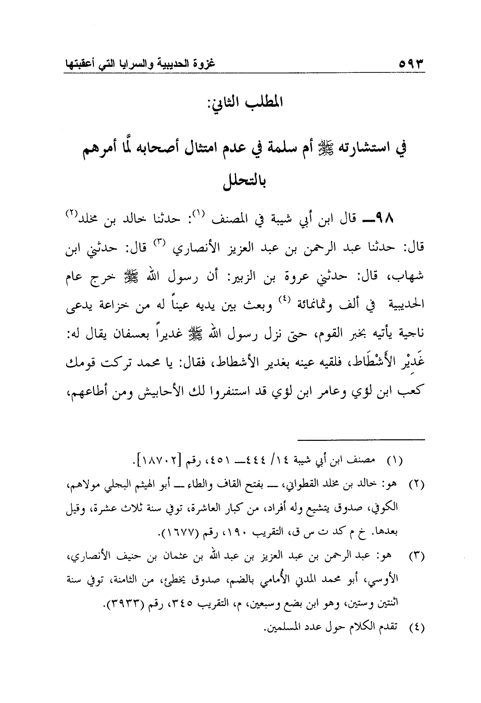 98- قال ابن أبي شيبة في المصنف1: حدثنا خالد بن مخلد2 قال: حدثنا عبد الرحمن بن عبد العزيز الأنصاري3 قال: حدثني ابن شهاب، قال: حدثني عروة بن الزبير: أن رسول الله صلى الله عليه وسلم خرج عام الحديبية في ألف وثمانمائة4 وبعث بين يديه عيناً له من خزاعة يدعى ناجية يأتيه بخبر القوم، حتى نزل رسول الله صلى الله عليه وسلم غديراً بعسفان يقال له: غَدِيْر الأَشْطَاط، فلقيه عينه بغدير الأشطاط، فقال: يا محمد تركت قومك كعب ابن لؤي وعامر ابن لؤي قد استنفروا لك الأحابيش ومن أطاعهم،