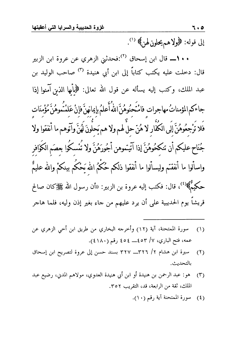 100- قال ابن إسحاق2:فحدثني الزهري عن عروة ابن الزبير قال: دخلت عليه يكتب كتاباً إلى ابن أبي هنيدة3 صاحب الوليد بن عبد الملك، وكتب إليه يسأله عن قول الله تعالى: {يَا أَيُّهَا الَّذِينَ آمَنُوا إِذَا جَاءَكُمُ الْمُؤْمِنَاتُ مُهَاجِرَاتٍ فَامْتَحِنُوهُنَّ اللَّهُ أَعْلَمُ بِإِيمَانِهِنَّ فَإِنْ عَلِمْتُمُوهُنَّ مُؤْمِنَاتٍ فَلا تَرْجِعُوهُنَّ إِلَى الْكُفَّارِ لا هُنَّ حِلٌّ لَهُمْ وَلا هُمْ يَحِلُّونَ لَهُنَّ وَآتُوهُمْ مَا أَنْفَقُوا وَلا جُنَاحَ عَلَيْكُمْ أَنْ تَنْكِحُوهُنَّ إِذَا آتَيْتُمُوهُنَّ أُجُورَهُنَّ وَلا تُمْسِكُوا بِعِصَمِ الْكَوَافِرِ وَاسْأَلُوا مَا أَنْفَقْتُمْ وَلْيَسْأَلوا مَا أَنْفَقُوا ذَلِكُمْ حُكْمُ اللَّهِ يَحْكُمُ بَيْنَكُمْ وَاللَّهُ عَلِيمٌ حَكِيمٌ} 4، قال: فكتب إليه عروة بن الزبير: "أن رسول الله صلى الله عليه وسلمكان صالح قريشاً يوم الحديبية على أن يرد عليهم من جاء بغير إذن وليه، فلما هاجر