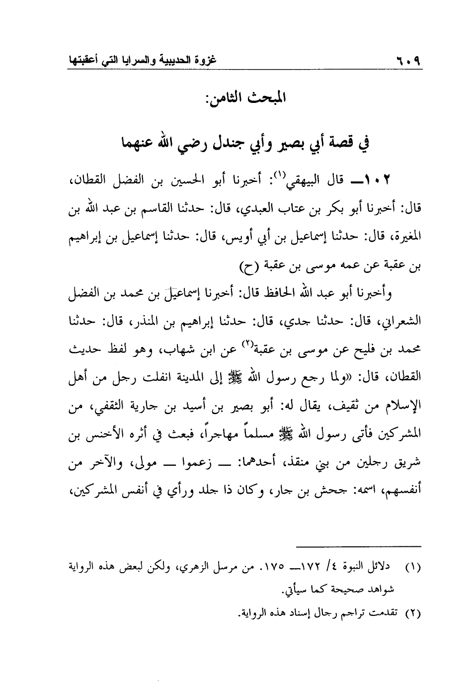 102- قال البيهقي1: أخبرنا أبو الحسين بن الفضل القطان، قال: أخبرنا أبو بكر بن عتاب العبدي، قال: حدثنا القاسم بن عبد الله بن المغيرة، قال: حدثنا إسماعيل بن أبي أويس، قال: حدثنا إسماعيل بن إبراهيم بن عقبة عن عمه موسى بن عقبة (ح) وأخبرنا أبو عبد الله الحافظ قال: أخبرنا إسماعيل بن محمد بن الفضل الشعراني، قال: حدثنا جدي، قال: حدثنا إبراهيم بن المنذر، قال: حدثنا محمد بن فليح عن موسى بن عقبة2 عن ابن شهاب، وهو لفظ حديث القطان، قال: "ولما رجع رسول الله صلى الله عليه وسلم إلى المدينة انفلت رجل من أهل الإسلام من ثقيف، يقال له: أبو بصير بن أسيد بن جارية الثقفي، من المشركين فأتى رسول الله صلى الله عليه وسلم مسلماً مهاجراً، فبعث في أثره الأخنس بن شريق رجلين من بني منقذ، أحدهما: - زعموا - مولى، والآخر من أنفسهم، اسمه: جحش بن جار، وكان ذا جلد ورأي في أنفس المشركين،