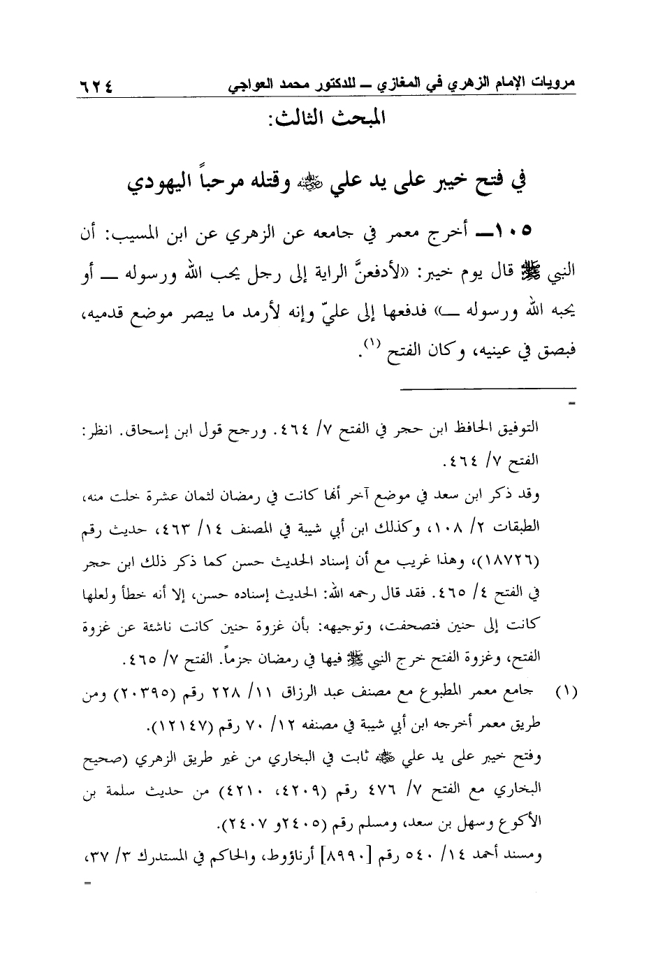 105- أخرج معمر في جامعه عن الزهري عن ابن المسيب: "أن النبي صلى الله عليه وسلم قال يوم خيبر: "لأدفعنَّ الراية إلى رجل يحب الله ورسوله - أو يحبه الله ورسوله" فدفعها إلى عليّ وإنه لأرمد ما يبصر موضع قدميه، فبصق في عينيه، وكان الفتح"1.
