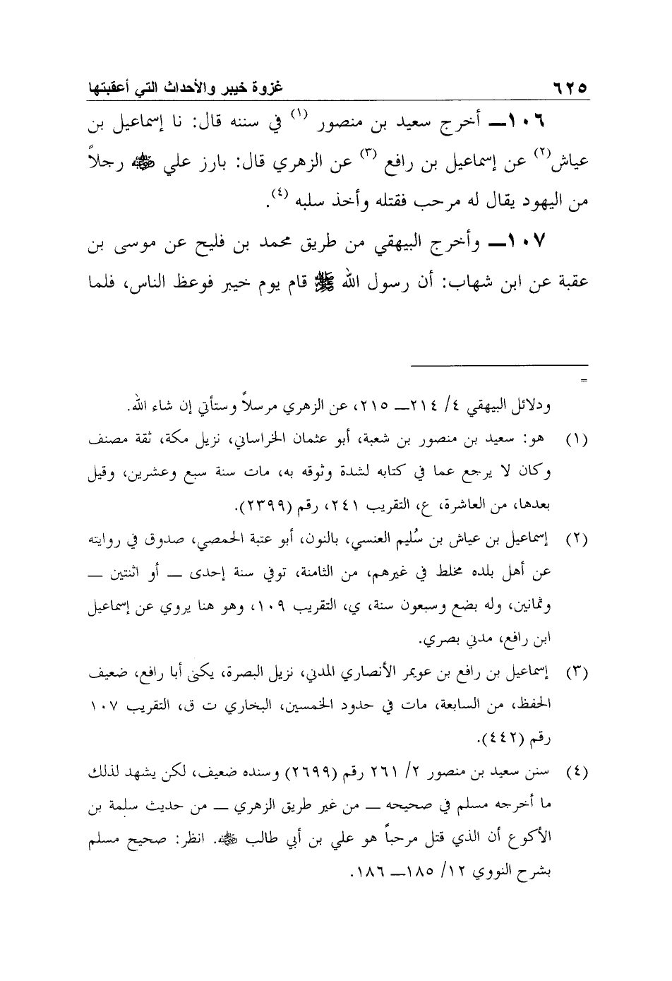 106- أخرج سعيد بن منصور1 في سننه قال: نا إسماعيل بن عياش2 عن إسماعيل بن رافع3 عن الزهري قال: بارز علي رضي الله عنه رجلاً من اليهود يقال له مرحب فقتله وأخذ سلبه4.