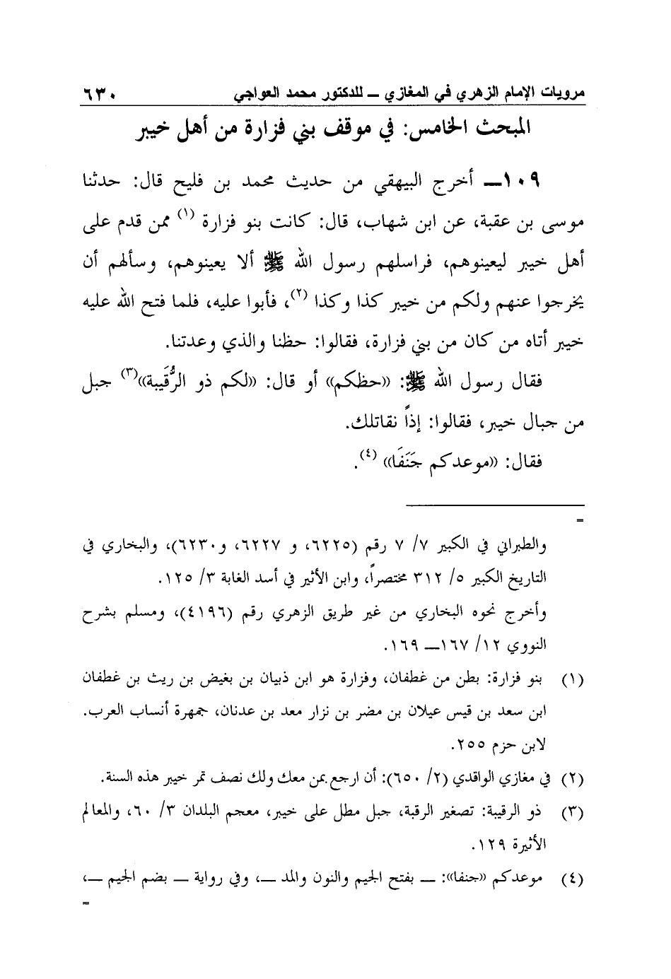 109- أخرج البيهقي من حديث محمد بن فليح قال: حدثنا موسى بن عقبة، عن ابن شهاب، قال: كانت بنو فزارة1 ممن قدم على أهل خيبر ليعينوهم، فراسلهم رسول الله صلى الله عليه وسلم ألا يعينوهم، وسألهم أن يخرجوا عنهم ولكم من خيبر كذا وكذا2، فأبوا عليه، فلما فتح الله عليه خيبر أتاه من كان من بني فزارة، فقالوا: حظنا والذي وعدتنا.