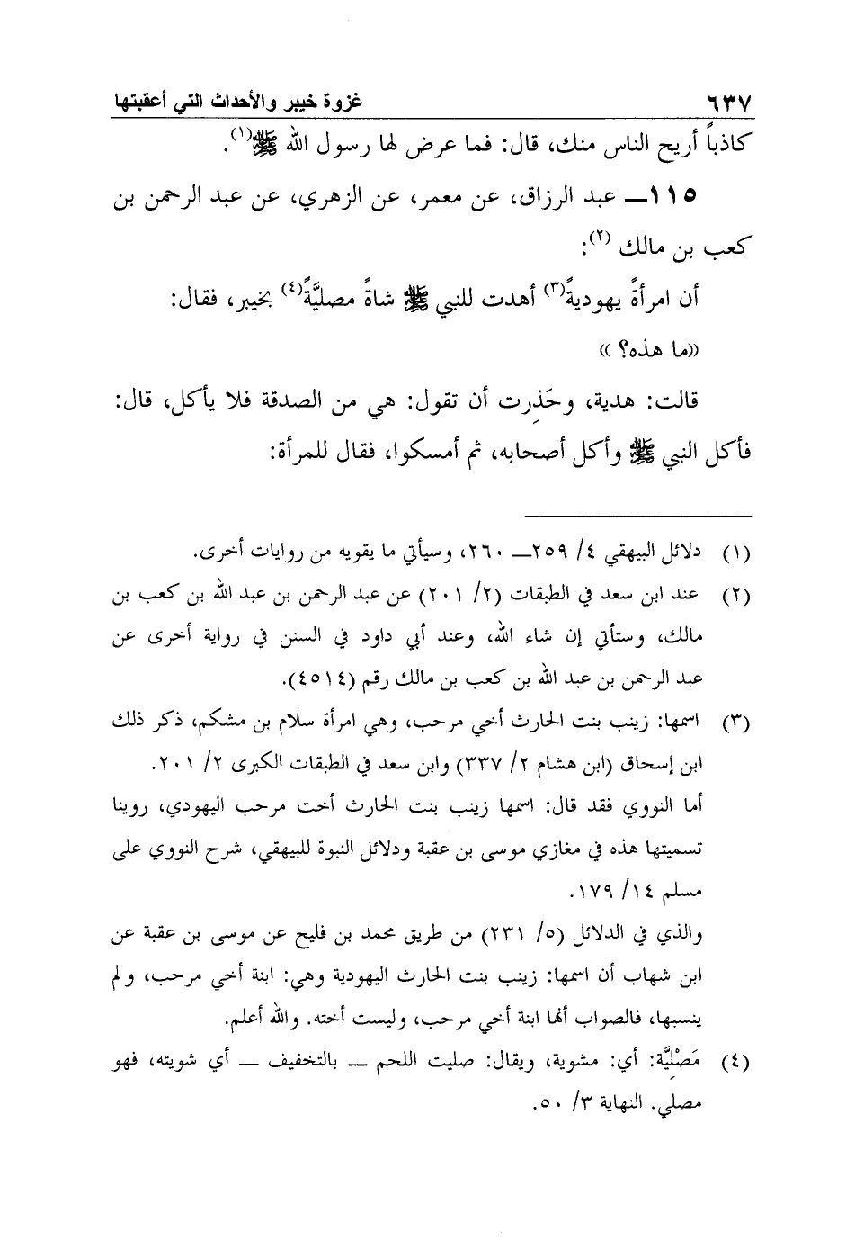 3 اسمها: زينب بنت الحارث أخي مرحب، وهي امرأة سلام بن مشكم، ذكر ذلك ابن إسحاق (ابن هشام 2/ 337) وابن سعد في الطبقات الكبرى 2/ 201.