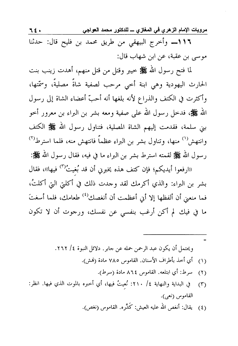 116- وأخرج البيهقي من طريق محمد بن فليح قال: حدثنا موسى بن عقبة، عن ابن شهاب قال: لما فتح رسول الله صلى الله عليه وسلم خيبر وقتل من قتل منهم، أهدت زينب بنت الحارث اليهودية وهي ابنة أخي مرحب لصفية شاةً مصليةً، وسمّتها، وأكثرت في الكتف والذراع لأنه بلغها أنه أحبّ أعضاء الشاة إلى رسول الله صلى الله عليه وسلم، فدخل رسول الله على صفية ومعه بشر بن البراء بن معرور أخو بني سلمة، فقدمت إليهم الشاة المصلية، فتناول رسول الله صلى الله عليه وسلم الكتف وانتهش1 منها، وتناول بشر بن البراء عظماً فانتهش منه، فلما استرط2 رسول الله صلى الله عليه وسلم لقمته استرط بشر بن البراء ما في فيه، فقال رسول الله صلى الله عليه وسلم: " ارفعوا أيديكم؛ فإن كتف هذه يخبرني أن قد بُغِيتُ3 فيها "، فقال بشر بن البراء: والذي أكرمك لقد وجدت ذلك في أكلتي التي أكلتُ، فما منعني أن ألفظها إلا أني أعظمت أن أنغصك4 طعامك، فلما أسغتَ ما في فيك لم أكن أرغب بنفسي عن نفسك، ورجوت أن لا تكون