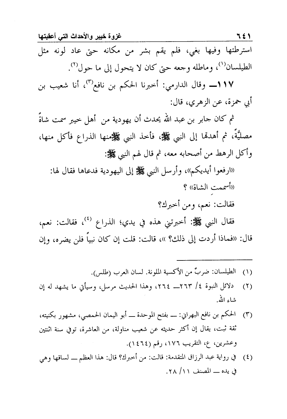 117- وقال الدارمي: أخبرنا الحكم بن نافع3، أنا شعيب بن أبي حمزة، عن الزهري، قال: ثم كان جابر بن عبد الله يحدث أن يهودية من أهل خيبر سمت شاةً مصليَّةً، ثم أهدتها إلى النبي صلى الله عليه وسلم، فأخذ النبي صلى الله عليه وسلممنها الذراع فأكل منها، وأكل الرهط من أصحابه معه، ثم قال لهم النبي صلى الله عليه وسلم: "ارفعوا أيديكم"، وأرسل النبي صلى الله عليه وسلم إلى اليهودية فدعاها فقال لها: "أسممتِ الشاة"؟ فقالت: نعم، ومن أخبرك؟ فقال النبي صلى الله عليه وسلم: "أخبرتني هذه في يدي؛ الذراع4، فقالت: نعم، قال: "فماذا أردت إلى ذلك؟ "، قالت: قلت إن كان نبياً فلن يضره، وإن