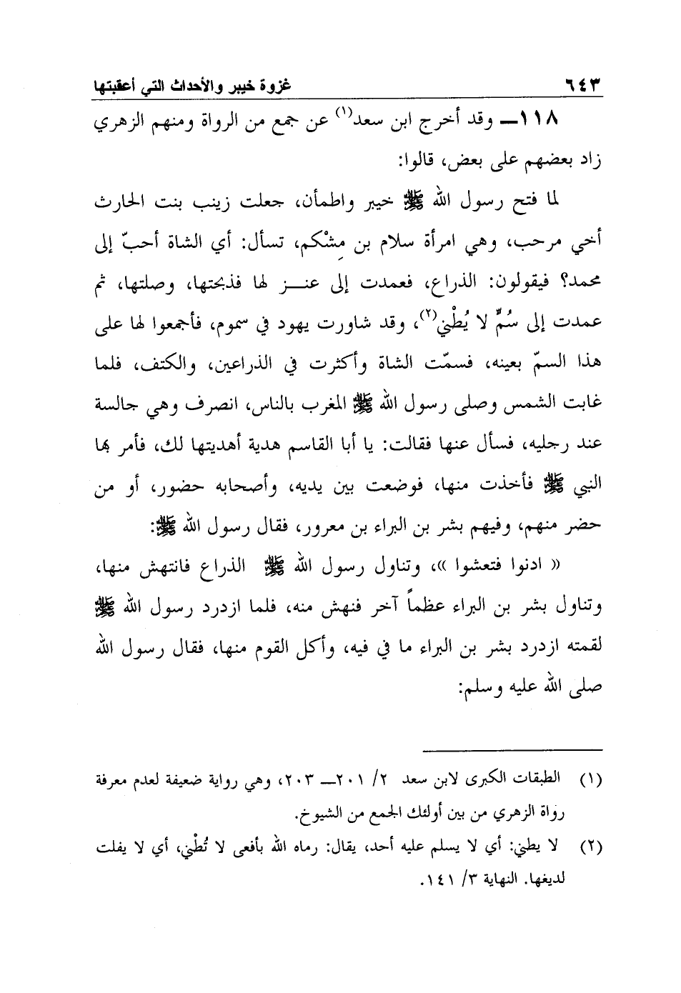 118- وقد أخرج ابن سعد 1 عن جمع من الرواة ومنهم الزهري زاد بعضهم على بعض، قالوا: لما فتح رسول الله صلى الله عليه وسلم خيبر واطمأن، جعلت زينب بنت الحارث أخي مرحب، وهي امرأة سلام بن مِشْكم، تسأل: أي الشاة أحبّ إلى محمد؟ فيقولون: الذراع، فعمدت إلى عنز لها فذبحتها، وصلتها، ثم عمدت إلى سُمٍّ لا يُطْني2، وقد شاورت يهود في سموم، فأجمعوا لها على هذا السمّ بعينه، فسمّت الشاة وأكثرت في الذراعين، والكتف، فلما غابت الشمس وصلى رسول الله صلى الله عليه وسلم المغرب بالناس، انصرف وهي جالسة عند رجليه، فسأل عنها فقالت: يا أبا القاسم هدية أهديتها لك، فأمر بها النبي صلى الله عليه وسلم فأخذت منها، فوضعت بين يديه، وأصحابه حضور، أو من حضر منهم، وفيهم بشر بن البراء بن معرور، فقال رسول الله صلى الله عليه وسلم: "ادنوا فتعشوا"، وتناول رسول الله صلى الله عليه وسلم الذراع فانتهش منها، وتناول بشر بن البراء عظماً آخر فنهش منه، فلما ازدرد رسول الله صلى الله عليه وسلم لقمته ازدرد بشر بن البراء ما في فيه، وأكل القوم منها، فقال رسول الله صلى الله عليه وسلم: