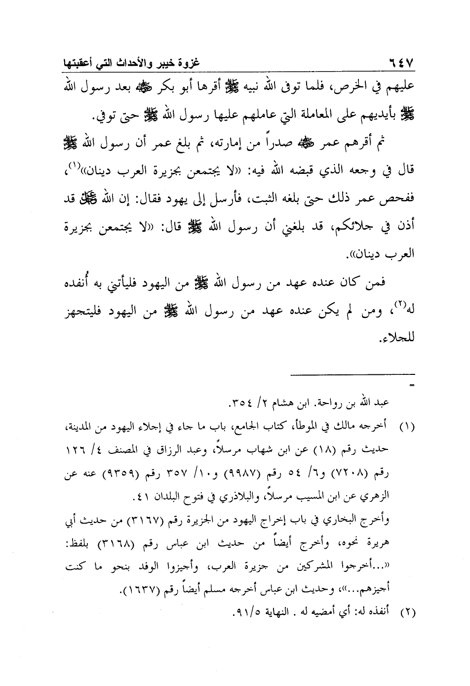 1 أخرجه مالك في الموطأ، كتاب الجامع، باب ما جاء في إجلاء اليهود من المدينة، حديث رقم (18) عن ابن شهاب مرسلاً، وعبد الرزاق في المصنف 4/ 126 رقم (7208) و6/ 54 رقم (9987) و10/ 357 رقم (9359) عنه عن الزهري عن ابن المسيب مرسلاً، والبلاذري في فتوح البلدان 41.
