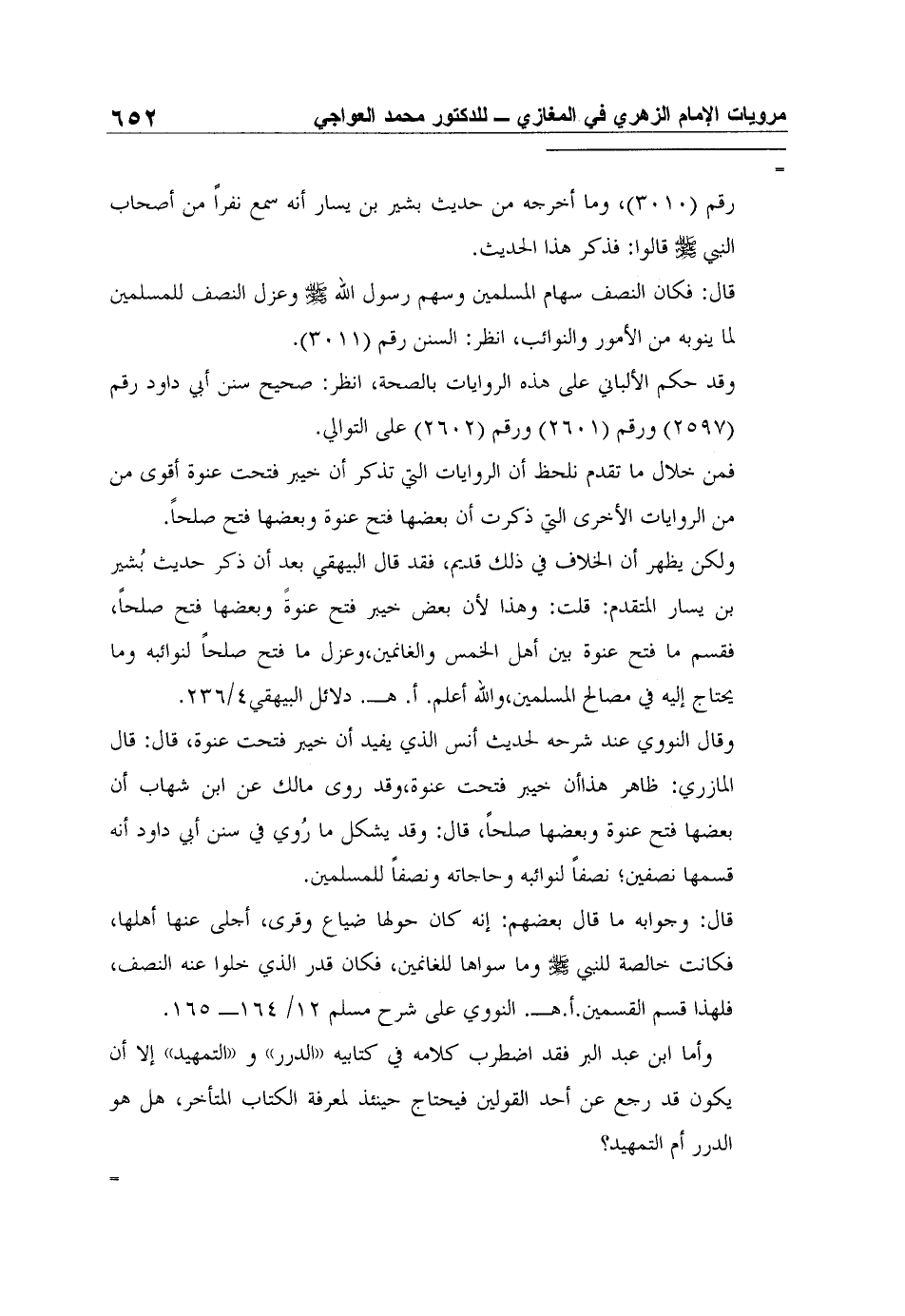 ولكن يظهر أن الخلاف في ذلك قديم، فقد قال البيهقي بعد أن ذكر حديث بُشير بن يسار المتقدم: قلت: وهذا لأن بعض خيبر فتح عنوةً وبعضها فتح صلحاً، فقسم ما فتح عنوة بين أهل الخمس والغانمين، وعزل ما فتح صلحاً لنوائبه وما يحتاج إليه في مصالح المسلمين، والله أعلم. أ. هـ. دلائل البيهقي4/236.