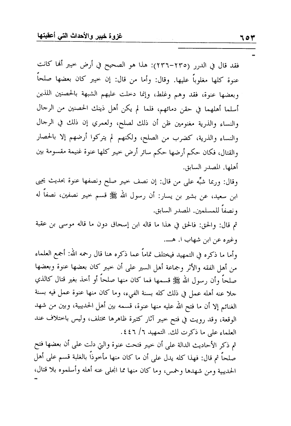 ثم ذكر الأحاديث الدالة على أن خيبر فتحت عنوة والتي دلت على أن بعضها فتح صلحاً ثم قال: فهذا كله يدل على أن ما كان منها مأخوذاً بالغلبة قسم على أهل الحديبية ومن شهدها وخمس، وما كان منها مما انجلى عنه أهله وأسلموه بلا قتال، حكم فيه رسول الله صلى الله عليه وسلم بحكم الفيء، واستخلص منه لنفسه كما فعل بفدك، فقف على هذا وتدبر الآثار تجدها على ذلك إن شاء الله. التمهيد 6/ 449.