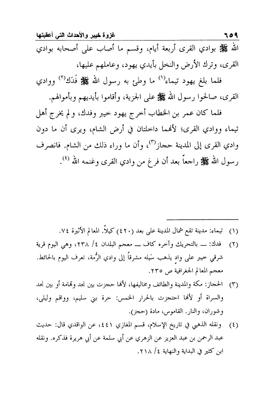 فلما كان عمر بن الخطاب أخرج يهود خيبر وفدك، ولم يخرج أهل تيماء ووادي القرى؛ لأنهما داخلتان في أرض الشام، ويرى أن ما دون وادي القرى إلى المدينة حجاز3، وأن ما وراء ذلك من الشام. فانصرف رسول الله صلى الله عليه وسلم راجعاً بعد أن فرغ من وادي القرى وغنمه الله4.