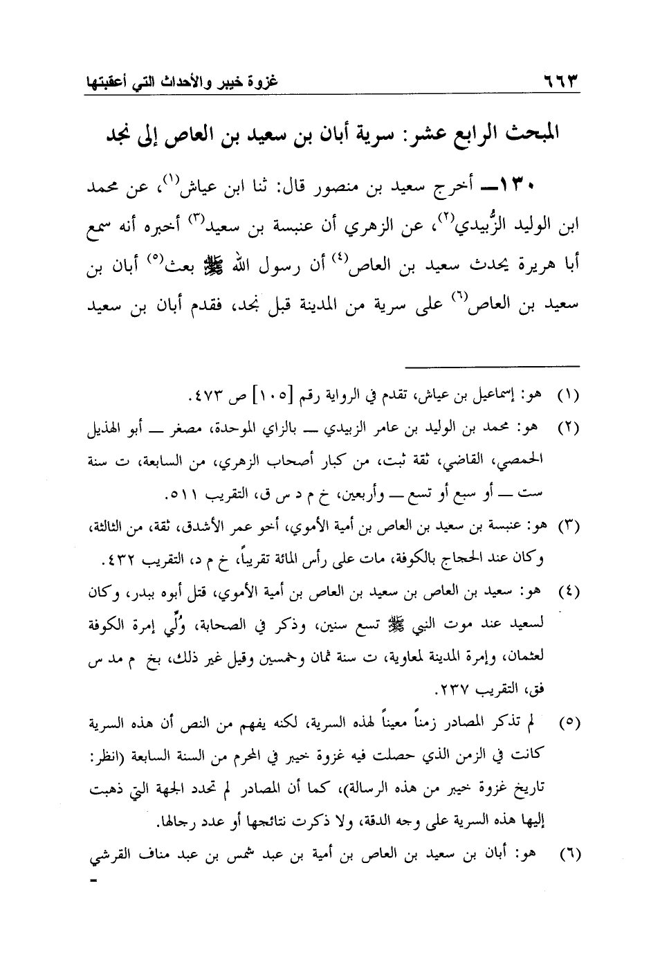130- أخرج سعيد بن منصور قال: ثنا ابن عياش1، عن محمد ابن الوليد الزُّبيدي2، عن الزهري أن عنبسة بن سعيد3 أخبره أنه سمع أبا هريرة يحدث سعيد بن العاص4 أن رسول الله صلى الله عليه وسلم بعث5 أبان بن سعيد بن العاص6 على سرية من المدينة قبل نجد، فقدم أبان بن سعيد