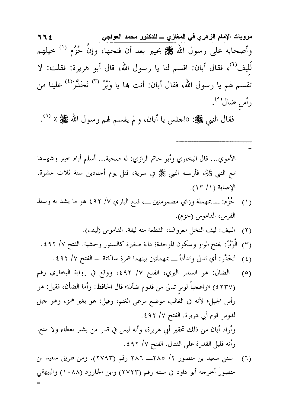 وأصحابه على رسول الله صلى الله عليه وسلم بخيبر بعد أن فتحها، وإنَّ حُزُم1 خيلهم لَلِيف2، فقال أبان: اقسم لنا يا رسول الله، قال أبو هريرة: فقلت: لا تقسم لهم يا رسول الله، فقال أبان: أنت بها يا وَبْرُ3 تَحَدَّرَ4 علينا من رأسِ ضال5. فقال النبي صلى الله عليه وسلم: "اجلس يا أبان، ولم يقسم لهم رسول الله صلى الله عليه وسلم"6.