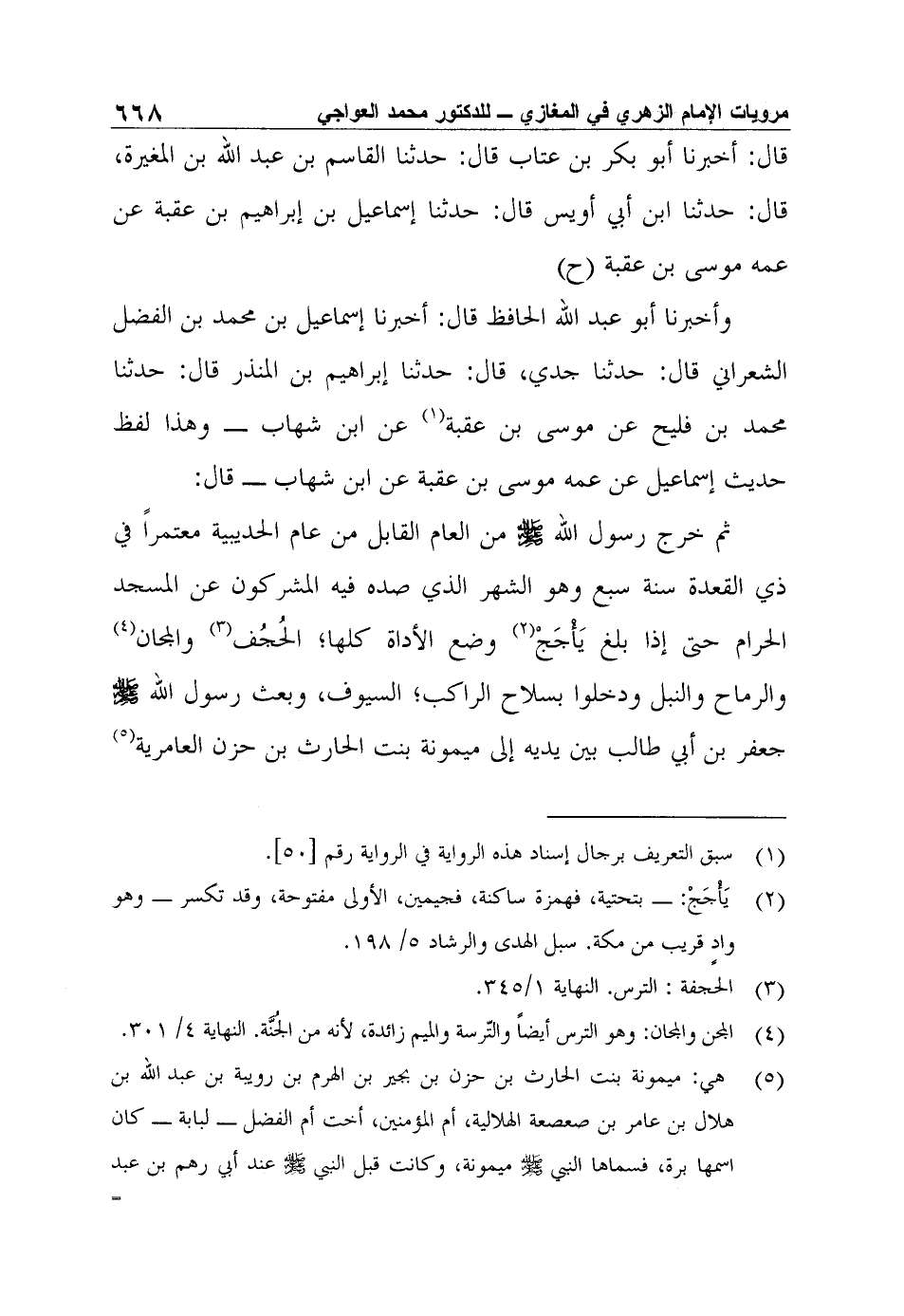 قال: أخبرنا أبو بكر بن عتاب قال: حدثنا القاسم بن عبد الله بن المغيرة، قال: حدثنا ابن أبي أويس قال: حدثنا إسماعيل بن إبراهيم بن عقبة عن عمه موسى بن عقبة (ح) وأخبرنا أبو عبد الله الحافظ قال: أخبرنا إسماعيل بن محمد بن الفضل الشعراني قال: حدثنا جدي، قال: حدثنا إبراهيم بن المنذر قال: حدثنا محمد بن فليح عن موسى بن عقبة1 عن ابن شهاب - قال: ثم خرج رسول الله صلى الله عليه وسلم من العام القابل من عام الحديبية معتمراً في ذي القعدة سنة سبع وهو الشهر الذي صده فيه المشركون عن المسجد الحرام حتى إذا بلغ يَأْجَجْ2 وضع الأداة كلها؛ الحُجُف3 والمجان4 والرماح والنبل ودخلوا بسلاح الراكب؛ السيوف، وبعث رسول الله صلى الله عليه وسلم جعفر بن أبي طالب بين يديه إلى ميمونة بنت الحارث بن حزن العامرية5