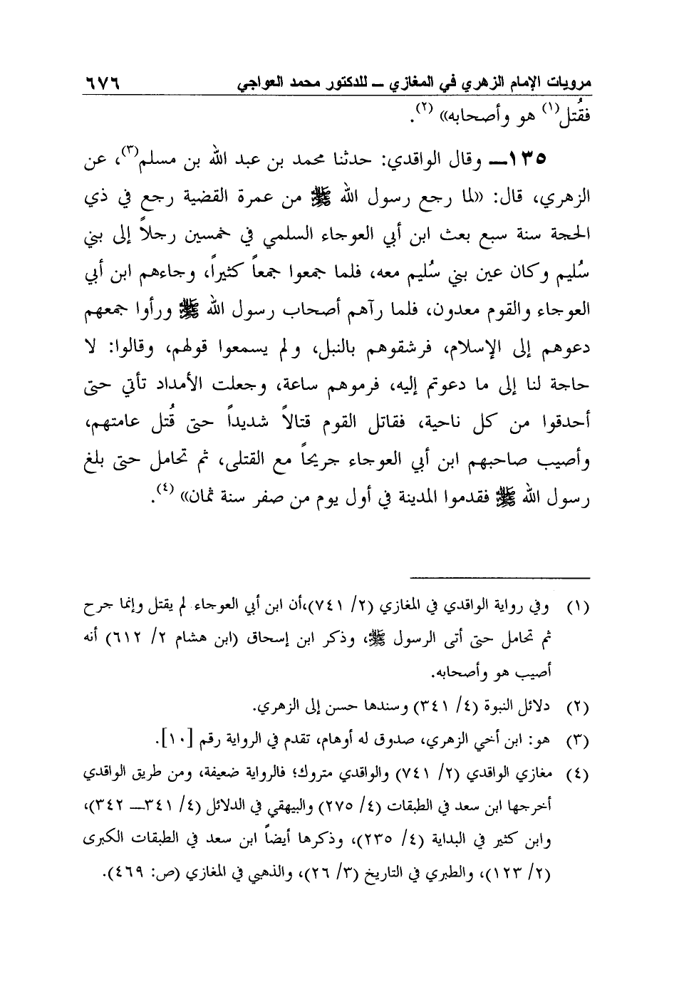 135- وقال الواقدي: حدثنا محمد بن عبد الله بن مسلم3، عن الزهري، قال: "لما رجع رسول الله صلى الله عليه وسلم من عمرة القضية رجع في ذي الحجة سنة سبع بعث ابن أبي العوجاء السلمي في خمسين رجلاً إلى بني سُليم وكان عين بني سُليم معه، فلما جمعوا جمعاً كثيراً، وجاءهم ابن أبي العوجاء والقوم معدون، فلما رآهم أصحاب رسول الله صلى الله عليه وسلم ورأوا جمعهم دعوهم إلى الإسلام، فرشقوهم بالنبل، ولم يسمعوا قولهم، وقالوا: لا حاجة لنا إلى ما دعوتم إليه، فرموهم ساعة، وجعلت الأمداد تأتي حتى أحدقوا من كل ناحية، فقاتل القوم قتالاً شديداً حتى قُتل عامتهم، وأصيب صاحبهم ابن أبي العوجاء جريحاً مع القتلى، ثم تحامل حتى بلغ رسول الله صلى الله عليه وسلم فقدموا المدينة في أول يوم من صفر سنة ثمان"4.