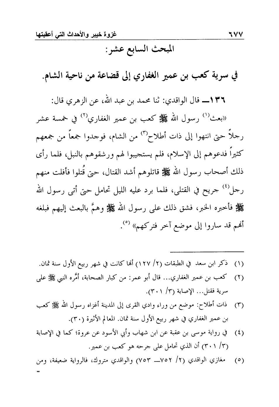 136- قال الواقدي: ثنا محمد بن عبد الله، عن الزهري قال: "بعث1 رسول الله صلى الله عليه وسلم كعب بن عمير الغفاري2 في خمسة عشر رجلاً حتى انتهوا إلى ذات أطلاح3 من الشام، فوجدوا جمعاً من جمعهم كثيراً فدعوهم إلى الإسلام، فلم يستجيبوا لهم ورشقوهم بالنبل، فلما رأى ذلك أصحاب رسول الله صلى الله عليه وسلم قاتلوهم أشد القتال، حتى قُتلوا فأفلت منهم رجل4 جريح في القتلى، فلما برد عليه الليل تحامل حتى أتى رسول الله صلى الله عليه وسلم فأخبره الخبر، فشق ذلك على رسول الله صلى الله عليه وسلم وهمَّ بالبعث إليهم فبلغه أنهم قد ساروا إلى موضع آخر فتركهم"5.