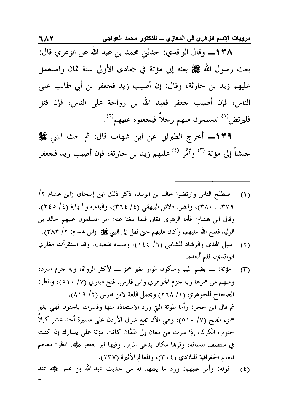 139- أخرج الطبراني عن ابن شهاب قال: ثم بعث النبي صلى الله عليه وسلم جيشاً إلى مؤتة3 وأمَّر4 عليهم زيد بن حارثة، فإن أصيب زيد فجعفر