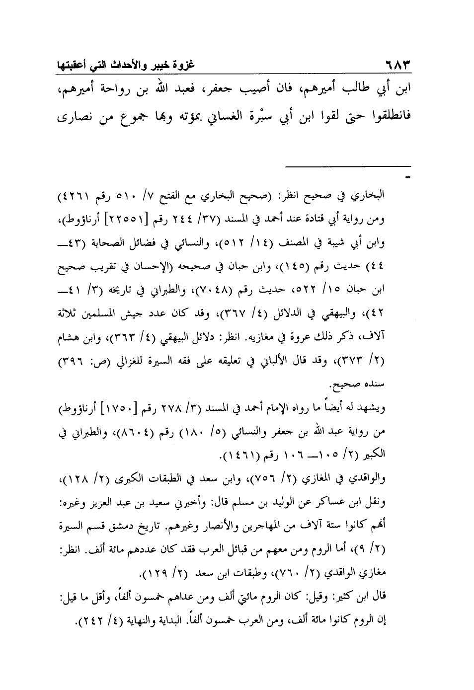 (صحيح البخاري مع الفتح 7/ 510 رقم 4261) ومن رواية أبي قتادة عند أحمد في المسند (37/ 244 رقم [22551] أرناؤوط) ، وابن أبي شيبة في المصنف (14/ 512) ، والنسائي في فضائل الصحابة (43- 44) حديث رقم (145) ، وابن حبان في صحيحه (الإحسان في تقريب صحيح ابن حبان 15/ 522، حديث رقم (7048) ، والطبراني في تاريخه (3/ 41- 42) ، والبيهقي في الدلائل (4/ 367) ، وقد كان عدد جيش المسلمين ثلاثة آلاف، ذكر ذلك عروة في مغازيه. انظر: دلائل البيهقي (4/ 363) ، وابن هشام (2/ 373) ، وقد قال الألباني في تعليقه على فقه السيرة للغزالي (ص: 396) "سنده صحيح".