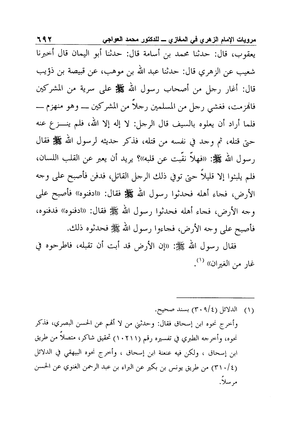 يعقوب، قال: حدثنا محمد بن أسامة قال: حدثنا أبو اليمان قال أخبرنا شعيب عن الزهري قال: حدثنا عبد الله بن موهب، عن قبيصة بن ذؤيب قال: أغار رجل من أصحاب رسول الله صلى الله عليه وسلم على سرية من المشركين فانهزمت، فغشي رجل من المسلمين رجلاً من المشركين - وهو منهزم - فلما أراد أن يعلوه بالسيف قال الرجل: لا إله إلا الله، فلم ينزع عنه حتى قتله، ثم وجد في نفسه من قتله، فذكر حديثه لرسول الله صلى الله عليه وسلم فقال رسول الله صلى الله عليه وسلم: " فهلاّ نقّبت عن قلبه؟ " يريد أن يعبر عن القلب اللسان، فلم يلبثوا إلا قليلاً حتى توفي ذلك الرجل القاتل، فدفن فأصبح على وجه الأرض، فجاء أهله فحدثوا رسول الله صلى الله عليه وسلم فقال: "ادفنوه" فأصبح على وجه الأرض، فجاء أهله فحدثوا رسول الله صلى الله عليه وسلم فقال: "ادفنوه" فدفنوه، فأصبح على وجه الأرض، فجاءوا رسول الله صلى الله عليه وسلم فحدثوه ذلك. فقال رسول الله صلى الله عليه وسلم: "إن الأرض قد أبت أن تقبله، فاطرحوه في غار من الغيران"1.