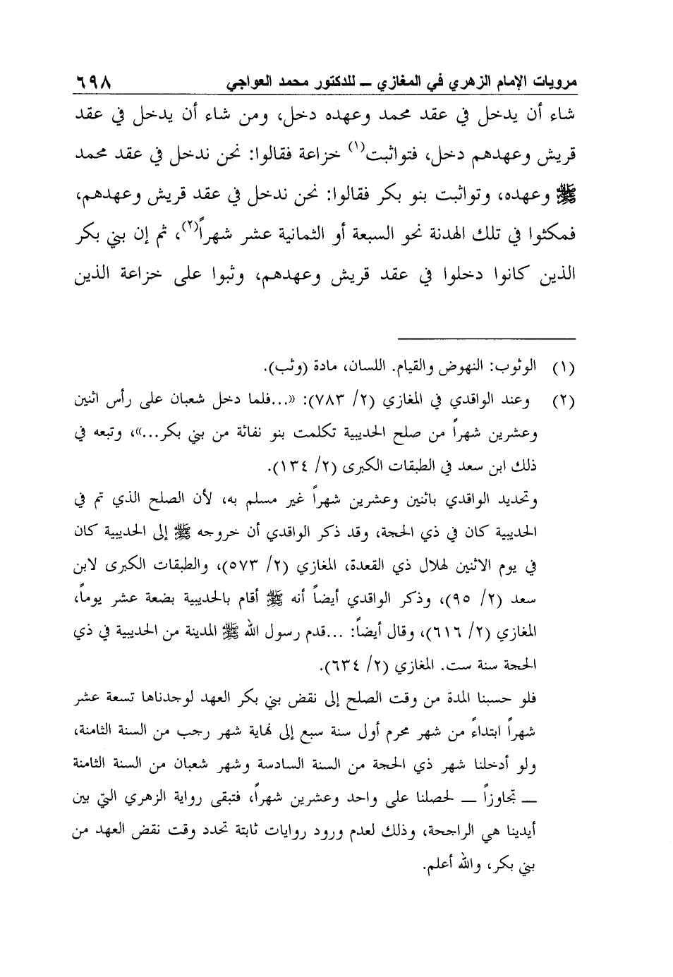2 وعند الواقدي في المغازي (2/ 783) : " ... فلما دخل شعبان على رأس اثنين وعشرين شهراً من صلح الحديبية تكلمت بنو نفاثة من بني بكر ... "، وتبعه في ذلك ابن سعد في الطبقات الكبرى (2/ 134) .