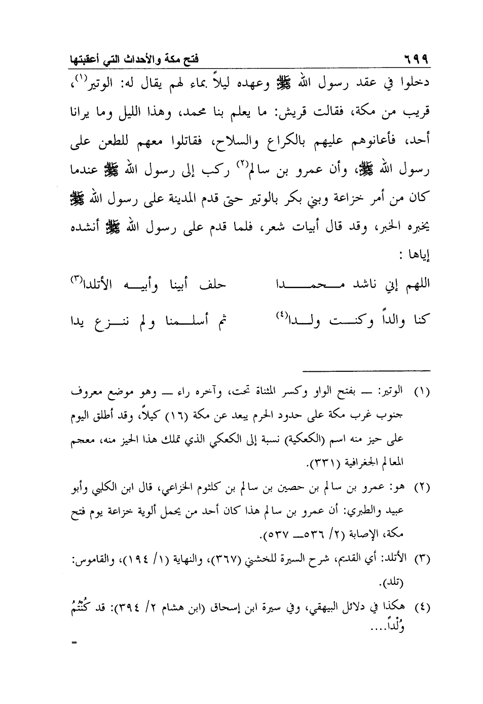 دخلوا في عقد رسول الله صلى الله عليه وسلم وعهده ليلاً بماء لهم يقال له: الوتير1، قريب من مكة، فقالت قريش: ما يعلم بنا محمد، وهذا الليل وما يرانا أحد، فأعانوهم عليهم بالكراع والسلاح، فقاتلوا معهم للطعن على رسول الله صلى الله عليه وسلم، وأن عمرو بن سالم2 ركب إلى رسول الله صلى الله عليه وسلم عندما كان من أمر خزاعة وبني بكر بالوتير حتى قدم المدينة على رسول الله صلى الله عليه وسلم يخبره الخبر، وقد قال أبيات شعر، فلما قدم على رسول الله صلى الله عليه وسلم أنشده إياها: