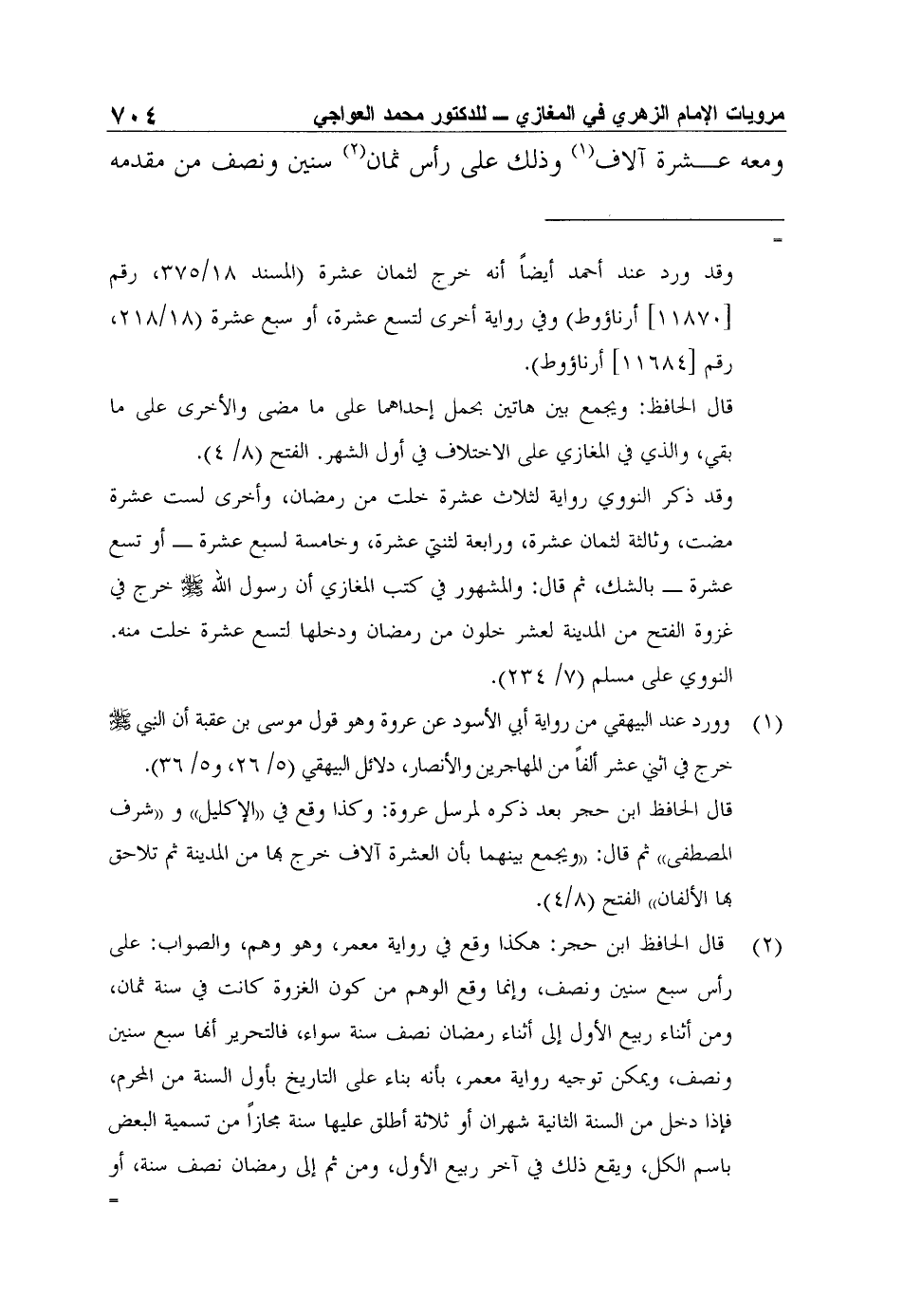 1 وورد عند البيهقي من رواية أبي الأسود عن عروة وهو قول موسى بن عقبة أن النبي صلى الله عليه وسلم خرج في اثني عشر ألفاً من المهاجرين والأنصار، دلائل البيهقي (5/ 26، و5/ 36) .