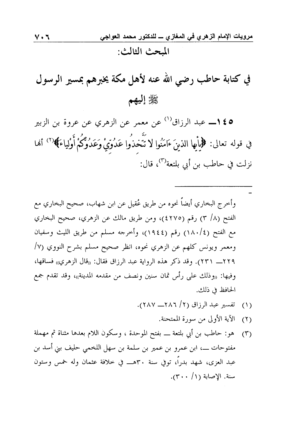 145- عبد الرزاق1 عن معمر عن الزهري عن عروة بن الزبير في قوله تعالى: {يأيها الذينَءَامَنُوا لا تَتَّخِذُوا عَدُوِّيْ وَعَدُوَّكُمْ أَوْلياءَ} 2 أنها نزلت في حاطب بن أبي بلتعة3، قال: