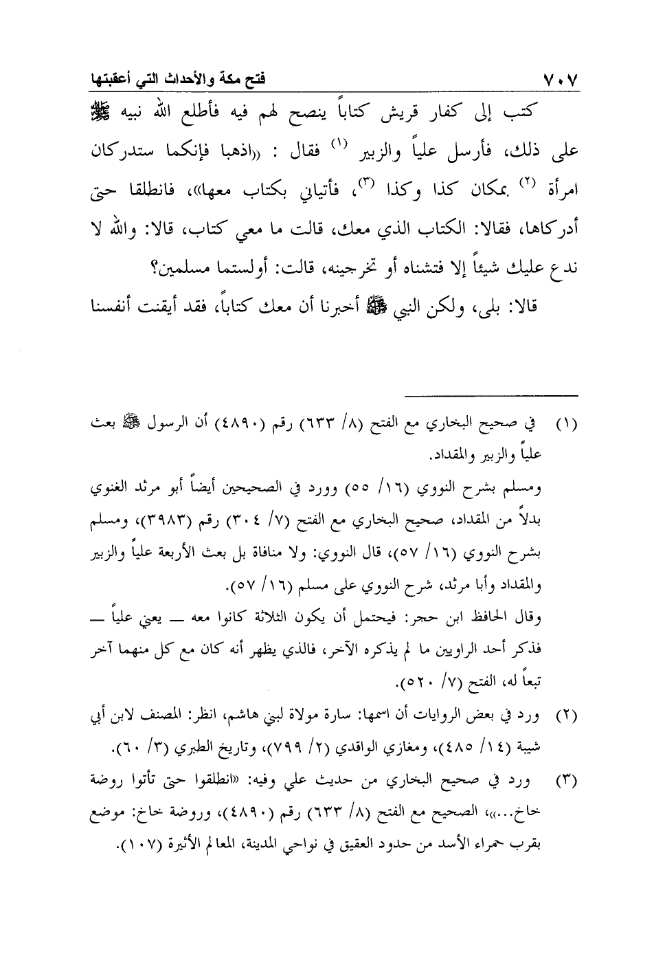 3 ورد في صحيح البخاري من حديث علي وفيه: (انطلقوا حتى تأتوا روضة خاخ ... ) ، الصحيح مع الفتح (8/ 633) رقم (4890) ، وروضة خاخ: موضع بقرب حمراء الأسد من حدود العقيق في نواحي المدينة، المعالم الأثيرة (107) .