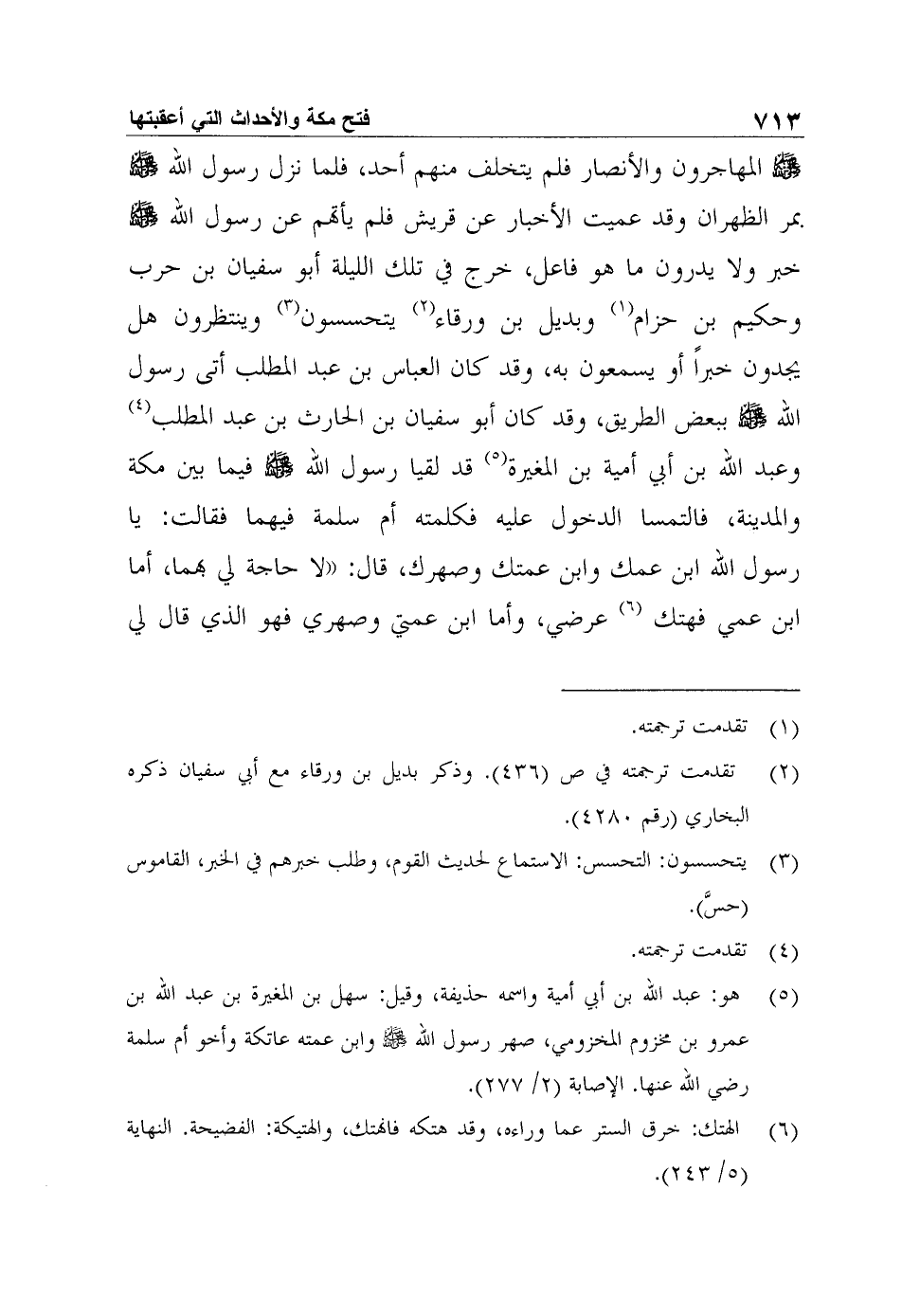 صلى الله عليه وسلم المهاجرون والأنصار فلم يتخلف منهم أحد، فلما نزل رسول الله صلى الله عليه وسلم بمر الظهران وقد عميت الأخبار عن قريش فلم يأتهم عن رسول الله صلى الله عليه وسلم خبر ولا يدرون ما هو فاعل، خرج في تلك الليلة أبو سفيان بن حرب وحكيم بن حزام1 وبديل بن ورقاء2 يتحسسون3 وينتظرون هل يجدون خبراً أو يسمعون به، وقد كان العباس بن عبد المطلب أتى رسول الله صلى الله عليه وسلم ببعض الطريق، وقد كان أبو سفيان بن الحارث بن عبد المطلب4 وعبد الله بن أبي أمية بن المغيرة5 قد لقيا رسول الله صلى الله عليه وسلم فيما بين مكة والمدينة، فالتمسا الدخول عليه فكلمته أم سلمة فيهما فقالت: يا رسول الله ابن عمك وابن عمتك وصهرك، قال: (لا حاجة لي بهما، أما ابن عمي فهتك6 عرضي، وأما ابن عمتي وصهري فهو الذي قال لي