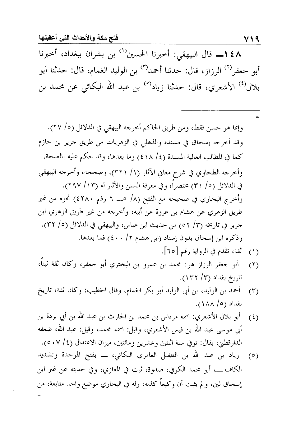 148- قال البيهقي: أخبرنا الحسين1 بن بشران ببغداد، أخبرنا أبو جعفر2 الرزاز، قال: حدثنا أحمد3 بن الوليد الغمام، قال: حدثنا أبو بلال4 الأشعري، قال: حدثنا زياد5 بن عبد الله البكائي عن محمد بن