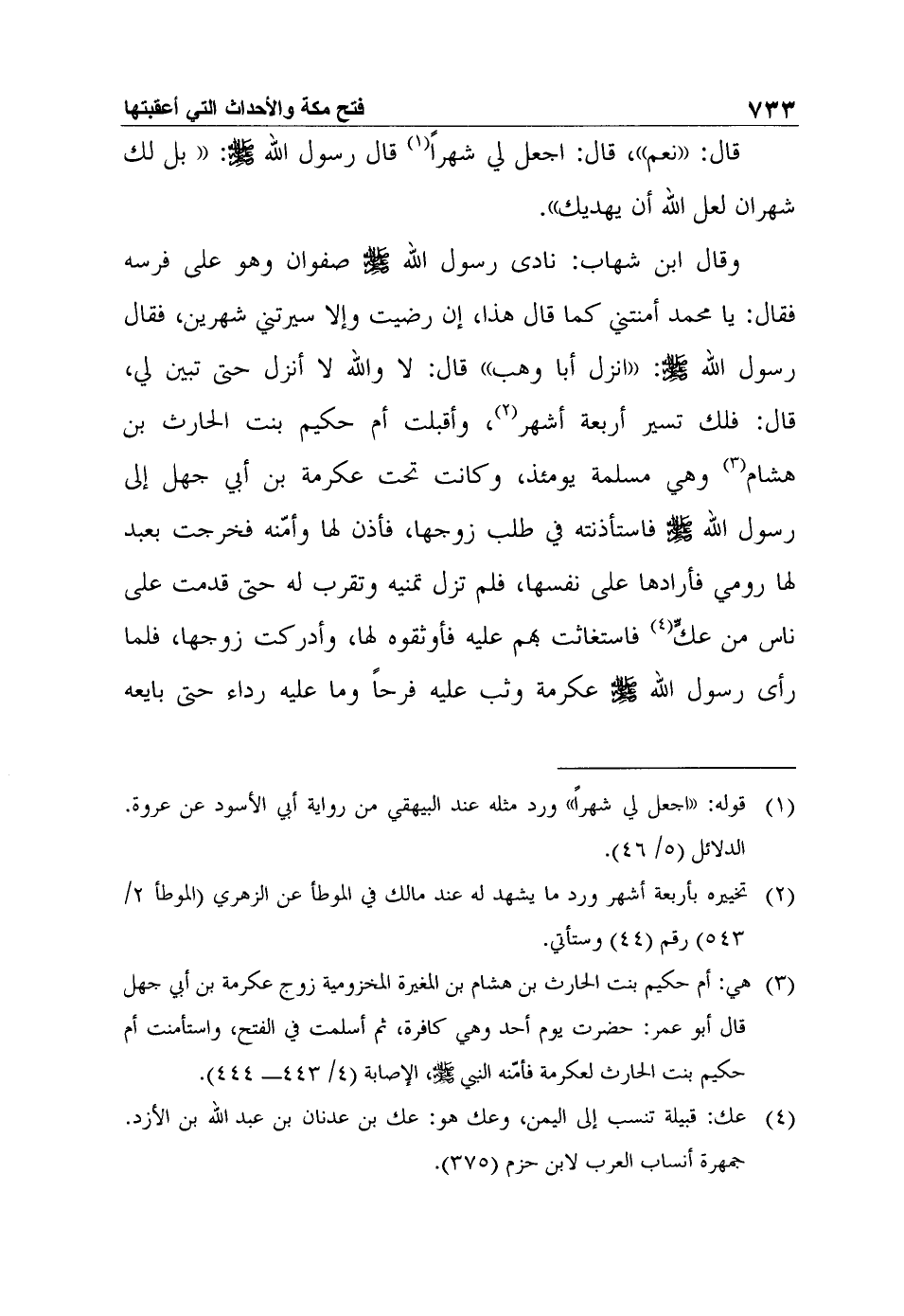 وقال ابن شهاب: نادى رسول الله صلى الله عليه وسلم صفوان وهو على فرسه فقال: يا محمد أمنتني كما قال هذا، إن رضيت وإلا سيرتني شهرين، فقال رسول الله صلى الله عليه وسلم: (انزل أبا وهب) قال: لا والله لا أنزل حتى تبين لي، قال: فلك تسير أربعة أشهر2، وأقبلت أم حكيم بنت الحارث بن هشام3 وهي مسلمة يومئذ، وكانت تحت عكرمة بن أبي جهل إلى رسول الله صلى الله عليه وسلم فاستأذنته في طلب زوجها، فأذن لها وأمّنه فخرجت بعبد لها رومي فأرادها على نفسها، فلم تزل تمنيه وتقرب له حتى قدمت على ناس من عكٍّ4 فاستغاثت بهم عليه فأوثقوه لها، وأدركت زوجها، فلما رأى رسول الله صلى الله عليه وسلم عكرمة وثب عليه فرحاً وما عليه رداء حتى بايعه