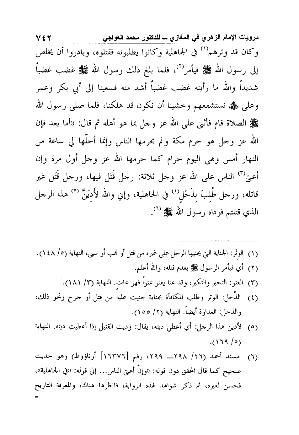 6 مسند أحمد (26/ 298- 299، رقم [16376] أرناؤوط) وهو حديث صحيح كما قال المحقق دون قوله: (وإنَّ أعتى الناس ... إلى قوله: (في الجاهلية) ، فحسن لغيره، ثم ذكر شواهد لهذه الرواية، فانظرها هناك، والمعرفة التاريخ للفسوي (1/ 397) ، والطبراني في الكبير (22/ 191) رقم (500) ، وقال في المجمع (7/ 174) ورجاله رجال الصحيح، وسنن البيهقي (8/ 71) ، وابن شاهين في الصحابة، كما في الإصابة لابن حجر (2/ 147) ، وأخرجه أبو جعفر الطبري من غير طريق الزهري، انظر: (تهذيب الآثار، السفر الأول من مسند ابن عباس ص: 41 حديث رقم [1] ) .