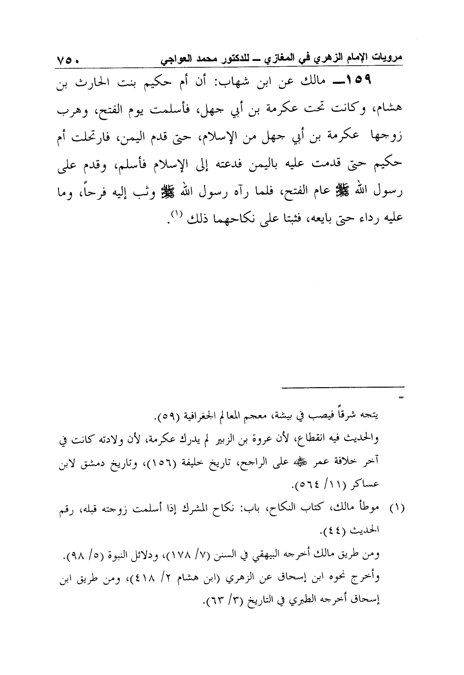 159- مالك عن ابن شهاب: أن أم حكيم بنت الحارث بن هشام، وكانت تحت عكرمة بن أبي جهل، فأسلمت يوم الفتح، وهرب زوجها عكرمة بن أبي جهل من الإسلام، حتى قدم اليمن، فارتحلت أم حكيم حتى قدمت عليه باليمن فدعته إلى الإسلام فأسلم، وقدم على رسول الله صلى الله عليه وسلم عام الفتح، فلما رآه رسول الله صلى الله عليه وسلم وثب إليه فرحاً، وما عليه رداء حتى بايعه، فثبتا على نكاحهما ذلك1.