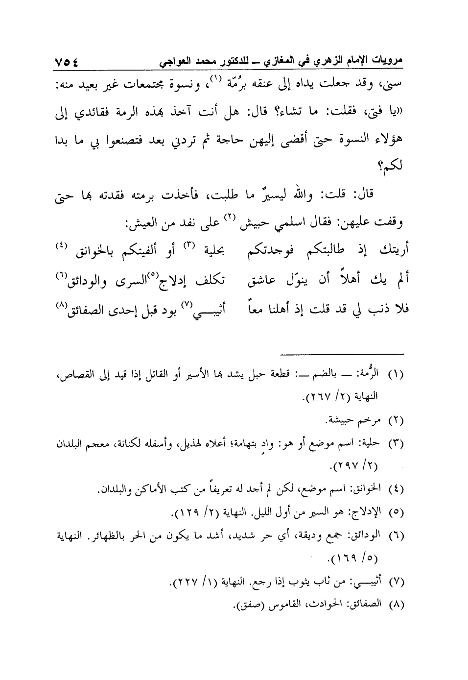قال: قلت: والله ليسيرٌ ما طلبت، فأخذت برمته فقدته بها حتى وقفت عليهن: فقال اسلمي حبيش2 على نفد من العيش: