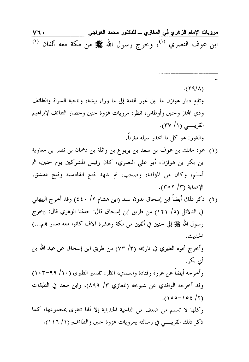 2 ذكر ذلك أيضاً ابن إسحاق بدون سند (ابن هشام 2/ 440) وقد أخرج البيهقي في الدلائل (5/ 121) من طريق ابن إسحاق قال: حدثنا الزهري قال: (خرج رسول الله صلى الله عليه وسلم إلى حنين في ألفين من مكة وعشرة آلاف كانوا معه فسار بهم ... ) الحديث.