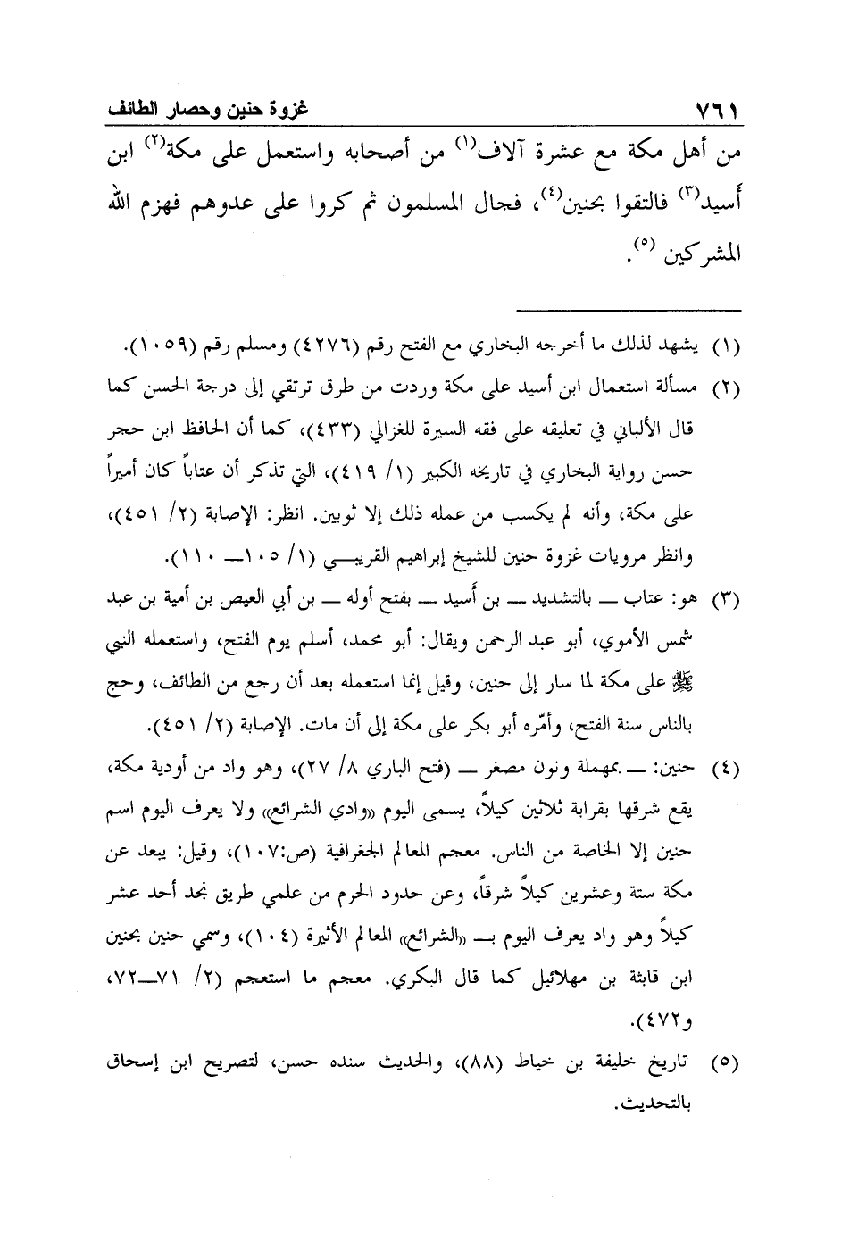 2 مسألة استعمال ابن أسيد على مكة وردت من طرق ترتقي إلى درجة الحسن كما قال الألباني في تعليقه على فقه السيرة للغزالي (433) ، كما أن الحافظ ابن حجر حسن رواية البخاري في تاريخه الكبير (1/ 419) ، التي تذكر أن عتاباً كان أميراً على مكة، وأنه لم يكسب من عمله ذلك إلا ثوبين. انظر: الإصابة (2/ 451) ، وانظر مرويات غزوة حنين للشيخ إبراهيم القريبي (1/ 105- 110) .