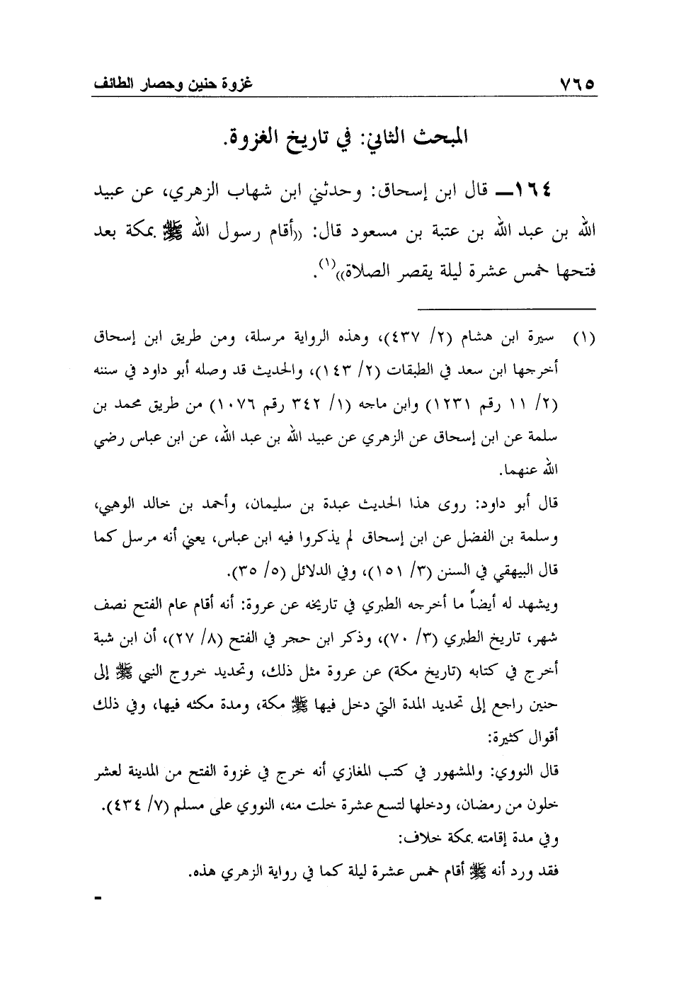 164- قال ابن إسحاق: وحدثني ابن شهاب الزهري، عن عبيد الله بن عبد الله بن عتبة بن مسعود قال: "أقام رسول الله صلى الله عليه وسلم بمكة بعد فتحها خمس عشرة ليلة يقصر الصلاة"1.