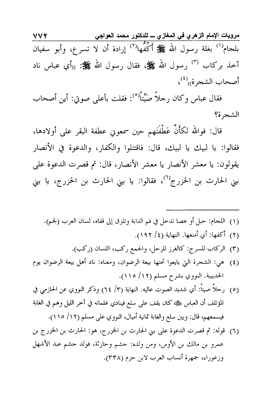 بلجام1 بغلة رسول الله صلى الله عليه وسلم أَكُفُّها2 إرادة أن لا تسرع، وأبو سفيان آخذ بركاب3 رسول الله صلى الله عليه وسلم، فقال رسول الله صلى الله عليه وسلم: "أي عباس ناد أصحاب الشجرة" 4، فقال عباس وكان رجلاً صَيِّتاً5: فقلت بأعلى صوتي: أين أصحاب الشجرة؟