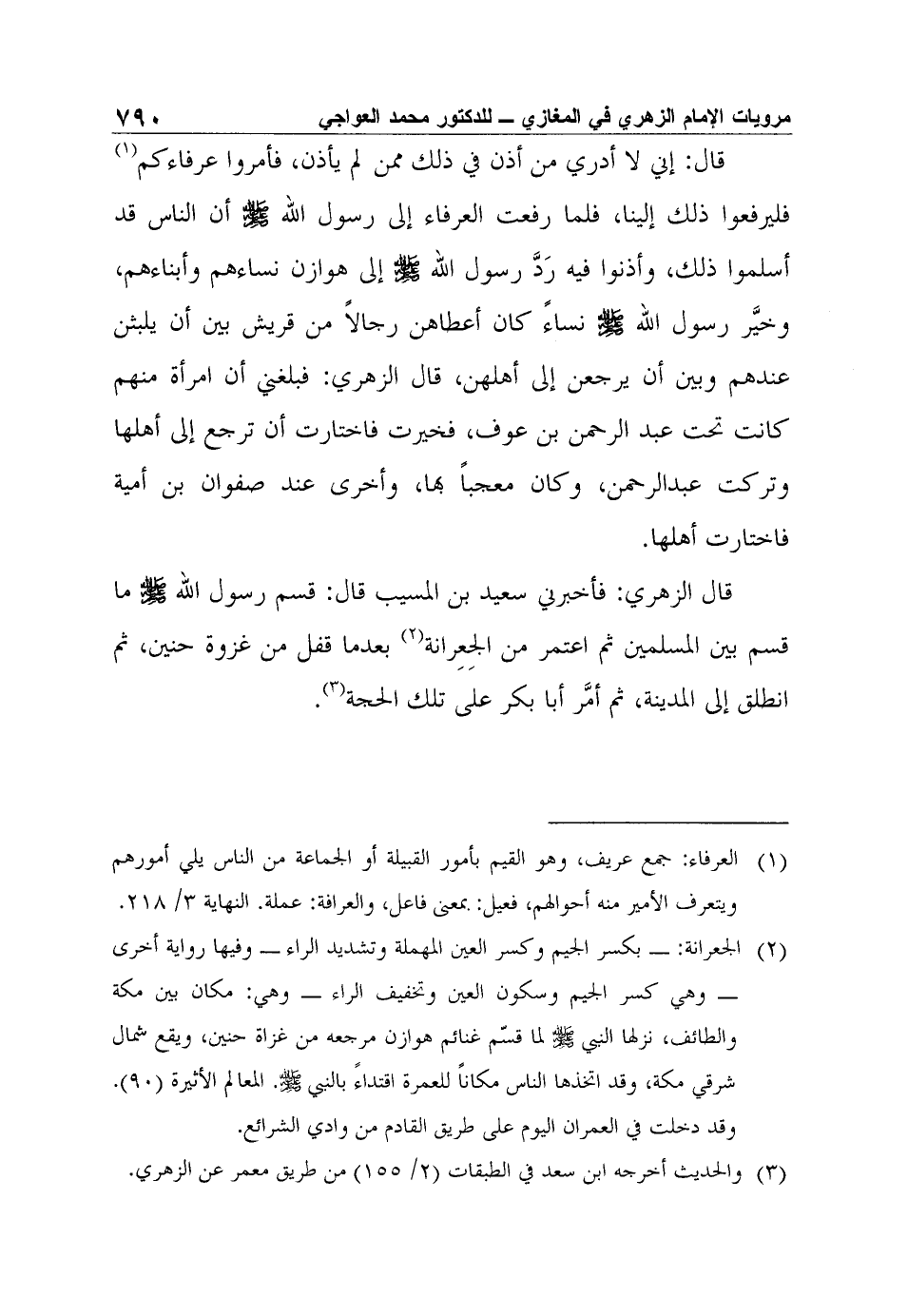 قال: إني لا أدري من أذن في ذلك ممن لم يأذن، فأمروا عرفاءكم1 فليرفعوا ذلك إلينا، فلما رفعت العرفاء إلى رسول الله صلى الله عليه وسلم أن الناس قد أسلموا ذلك، وأذنوا فيه رَدَّ رسول الله صلى الله عليه وسلم إلى هوازن نساءهم وأبناءهم، وخيَّر رسول الله صلى الله عليه وسلم نساءً كان أعطاهن رجالاً من قريش بين أن يلبثن عندهم وبين أن يرجعن إلى أهلهن، قال الزهري: فبلغني أن امرأة منهم كانت تحت عبد الرحمن بن عوف، فخيرت فاختارت أن ترجع إلى أهلها وتركت عبد الرحمن، وكان معجباً بها، وأخرى عند صفوان بن أمية فاختارت أهلها.
