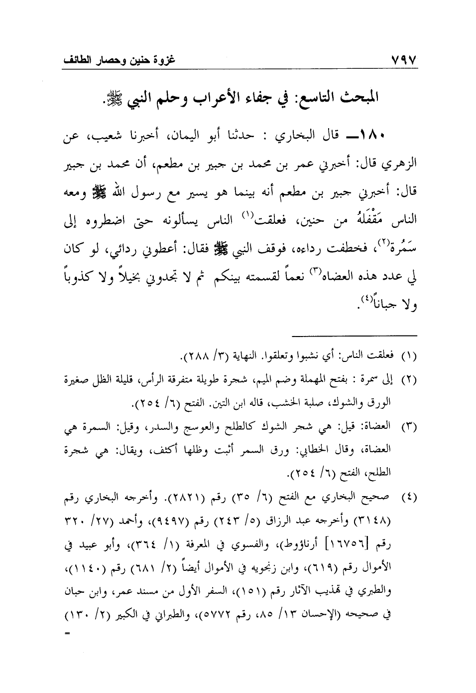 180- قال البخاري: حدثنا أبو اليمان، أخبرنا شعيب، عن الزهري قال: أخبرني عمر بن محمد بن جبير بن مطعم، أن محمد بن جبير قال: أخبرني جبير بن مطعم أنه بينما هو يسير مع رسول الله صلى الله عليه وسلم ومعه الناس مَقْفَلهُ من حنين، فعلقت1 الناس يسألونه حتى اضطروه إلى سَمُرة2، فخطفت رداءه، فوقف النبي صلى الله عليه وسلم فقال: أعطوني ردائي، لو كان لي عدد هذه العضاه3 نعماً لقسمته بينكم ثم لا تجدوني بخيلاً ولا كذوباً ولا جباناً4.