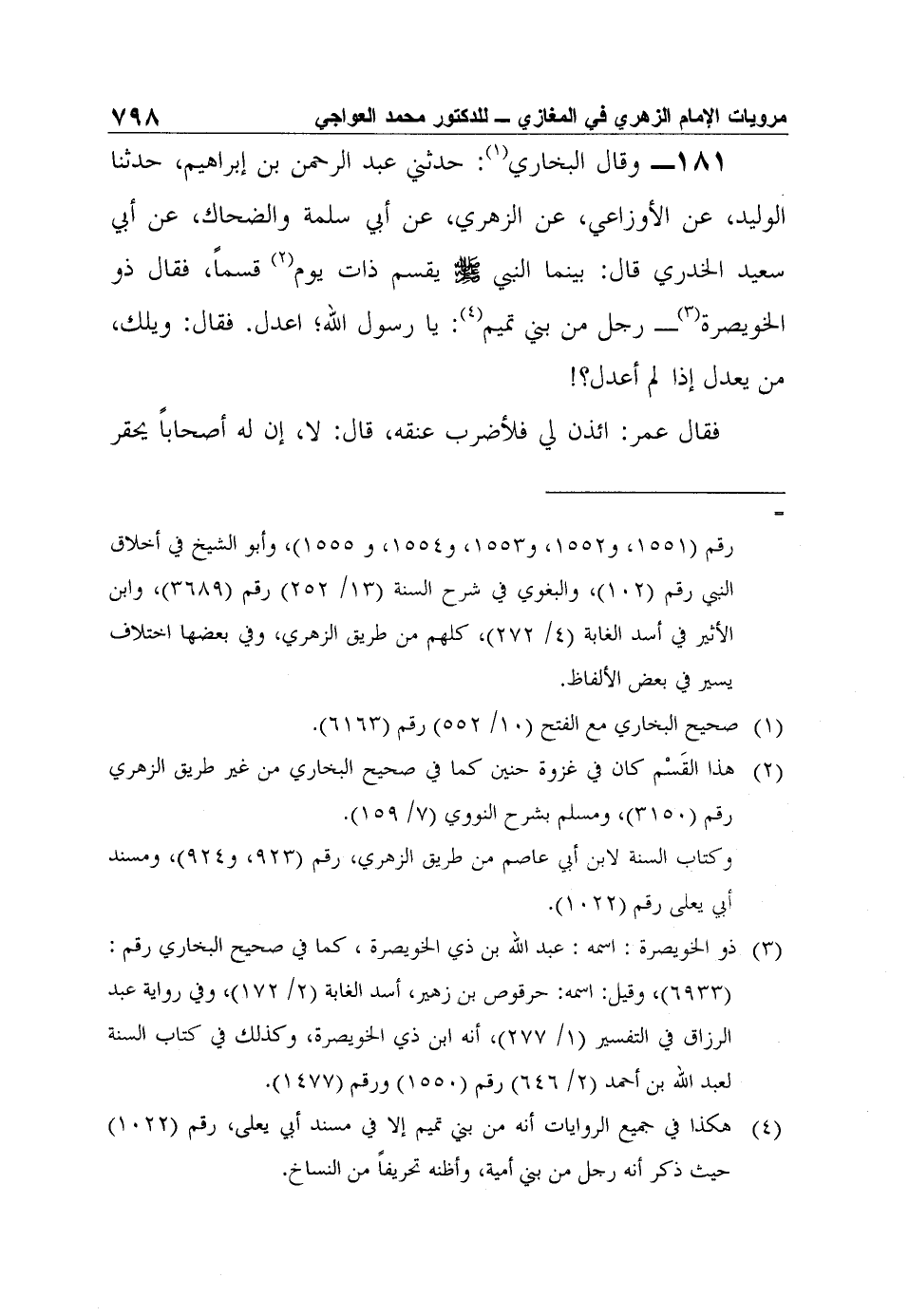 181- وقال البخاري1: حدثني عبد الرحمن بن إبراهيم، حدثنا الوليد، عن الأوزاعي، عن الزهري، عن أبي سلمة والضحاك، عن أبي سعيد الخدري قال: بينما النبي صلى الله عليه وسلم يقسم ذات يوم2قسماً، فقال ذو الخويصرة3- رجل من بني تميم4: يا رسول الله؛ اعدل. فقال: ويلك، من يعدل إذا لم أعدل؟!