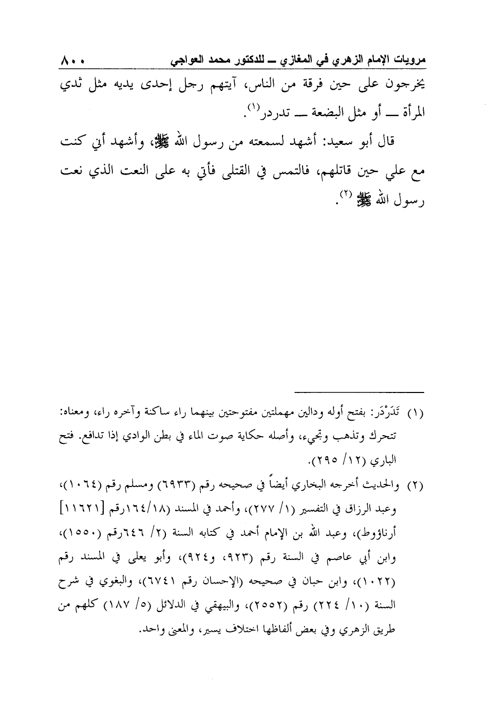 قال أبو سعيد: أشهد لسمعته من رسول الله صلى الله عليه وسلم، وأشهد أني كنت مع علي حين قاتلهم، فالتمس في القتلى فأتي به على النعت الذي نعت رسول الله صلى الله عليه وسلم2.