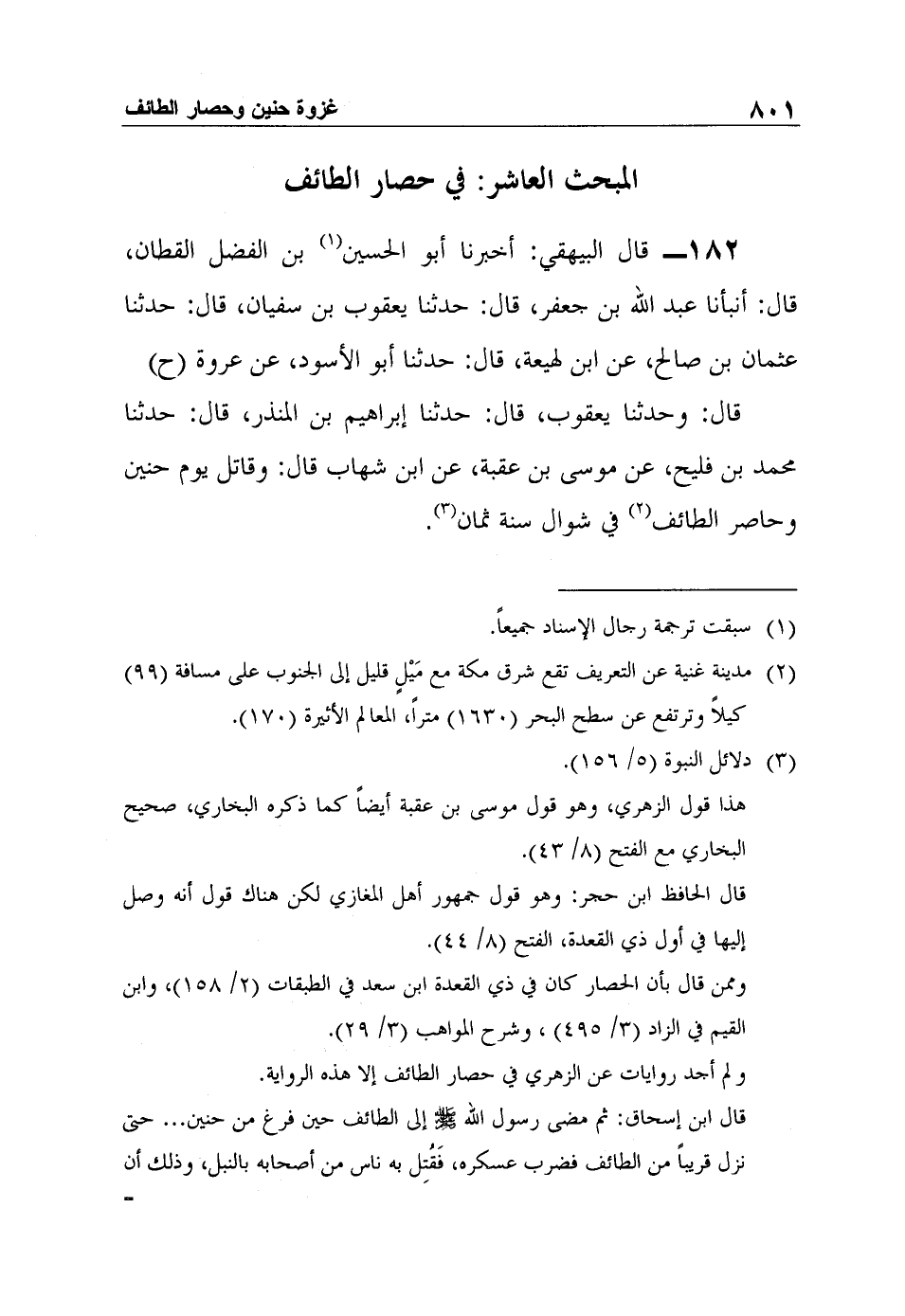 182- قال البيهقي: أخبرنا أبو الحسين1 بن الفضل القطان، قال: أنبأنا عبد الله بن جعفر، قال: حدثنا يعقوب بن سفيان، قال: حدثنا عثمان بن صالح، عن ابن لهيعة، قال: حدثنا أبو الأسود، عن عروة (ح) قال: وحدثنا يعقوب، قال: حدثنا إبراهيم بن المنذر، قال: حدثنا محمد بن فليح، عن موسى بن عقبة، عن ابن شهاب قال: وقاتل يوم حنين وحاصر الطائف2 في شوال سنة ثمان3.